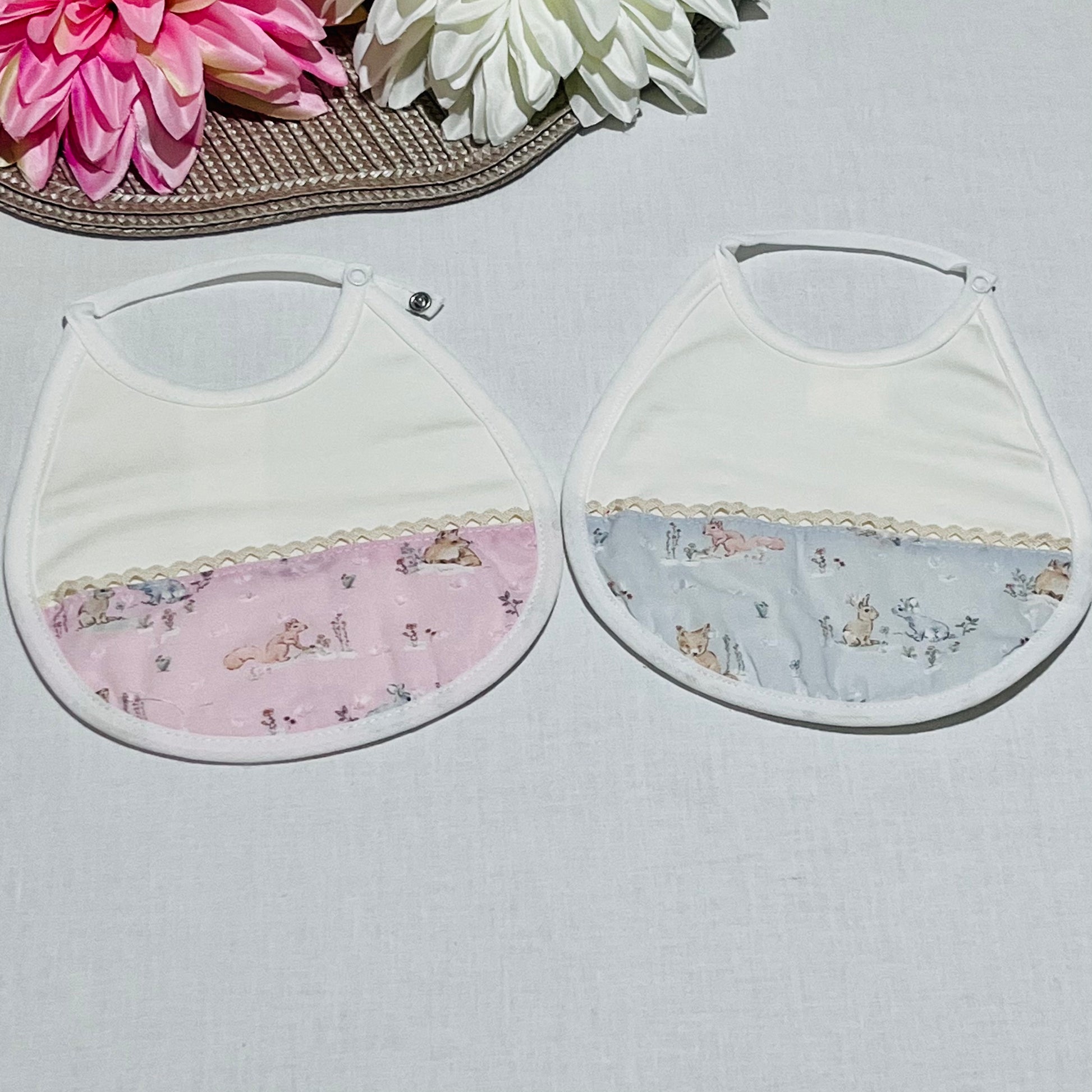 Babete em algodão muito fofinha com estampa de bichinhos e renda.