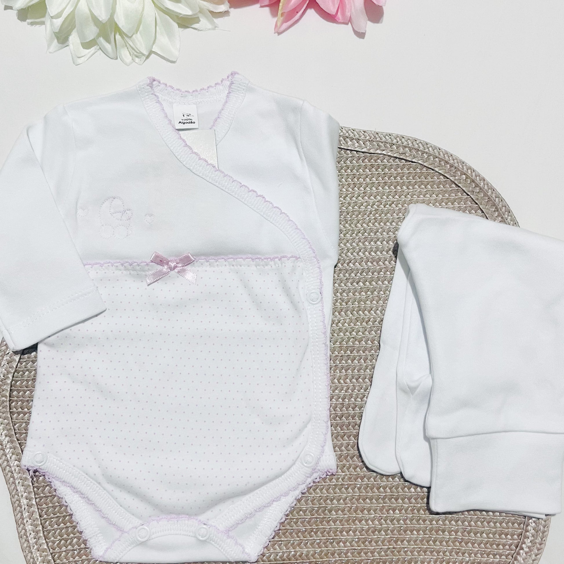 Body e collant interior com carrinho de bebé rosa no peito e laço