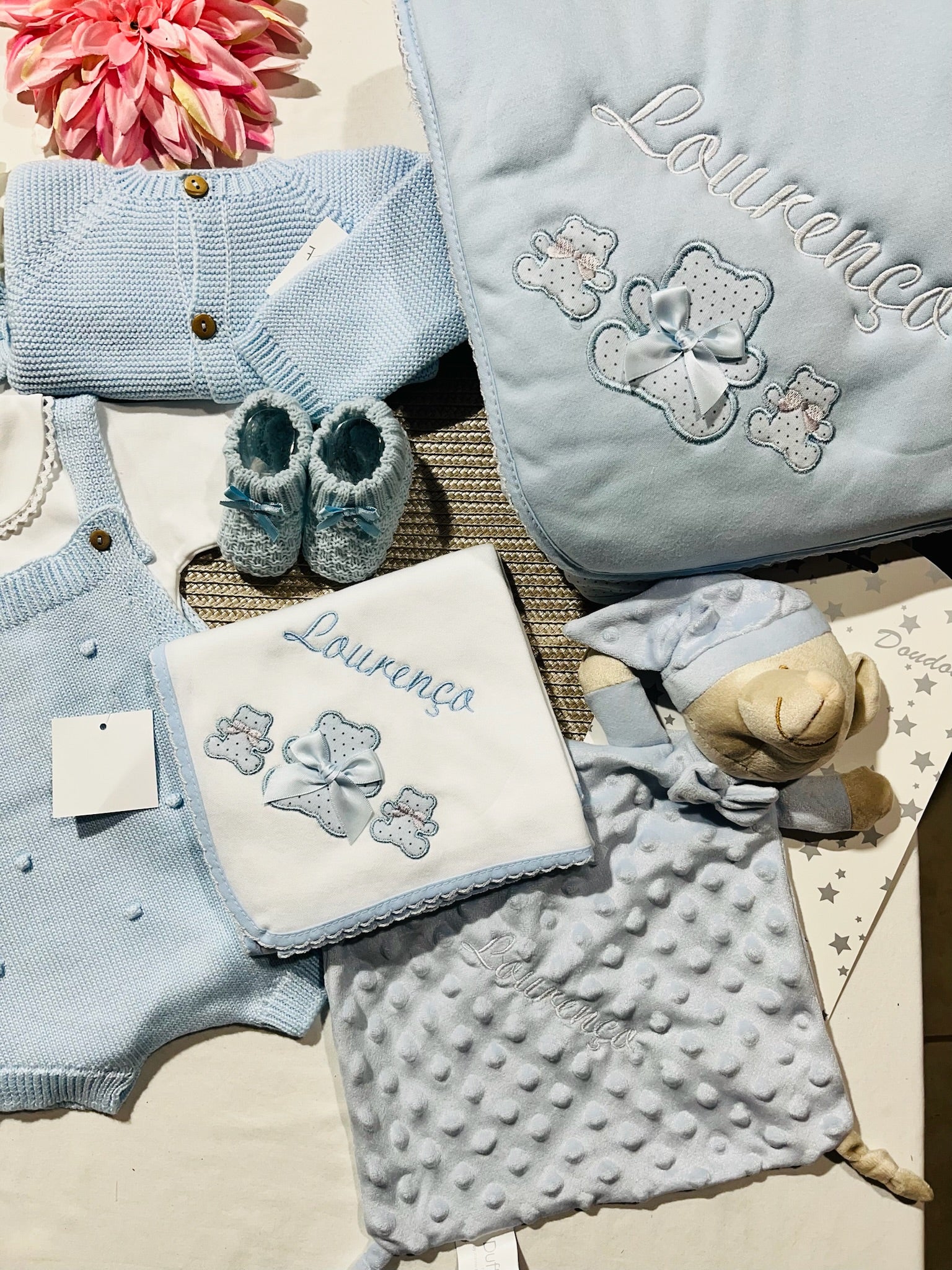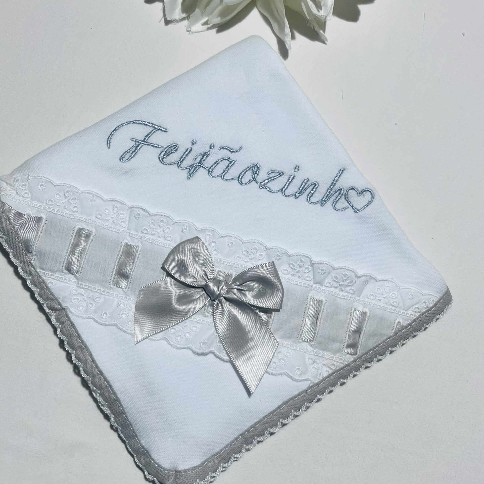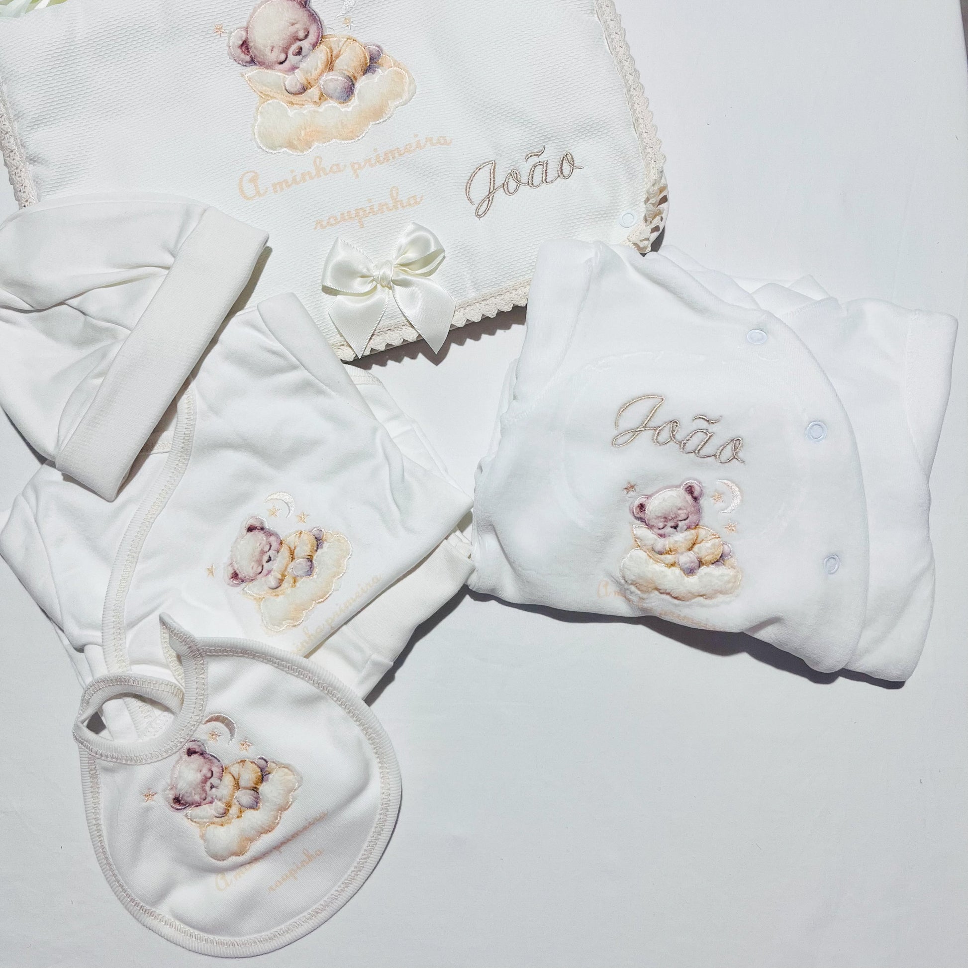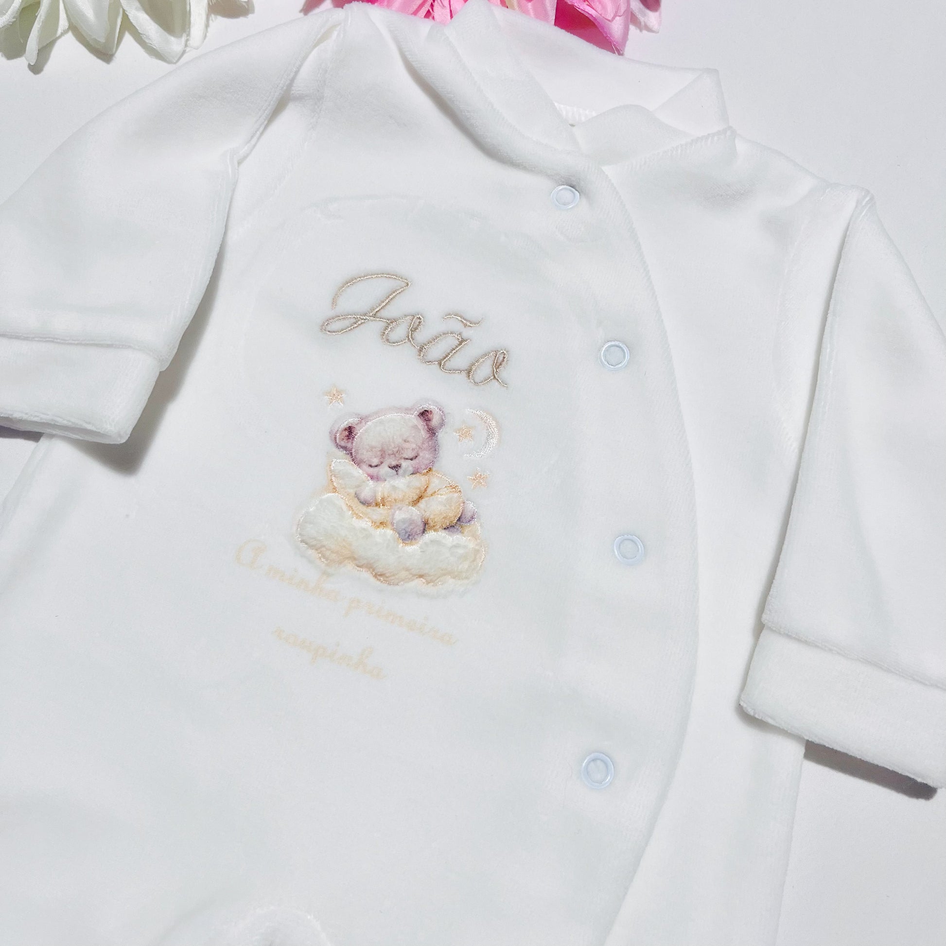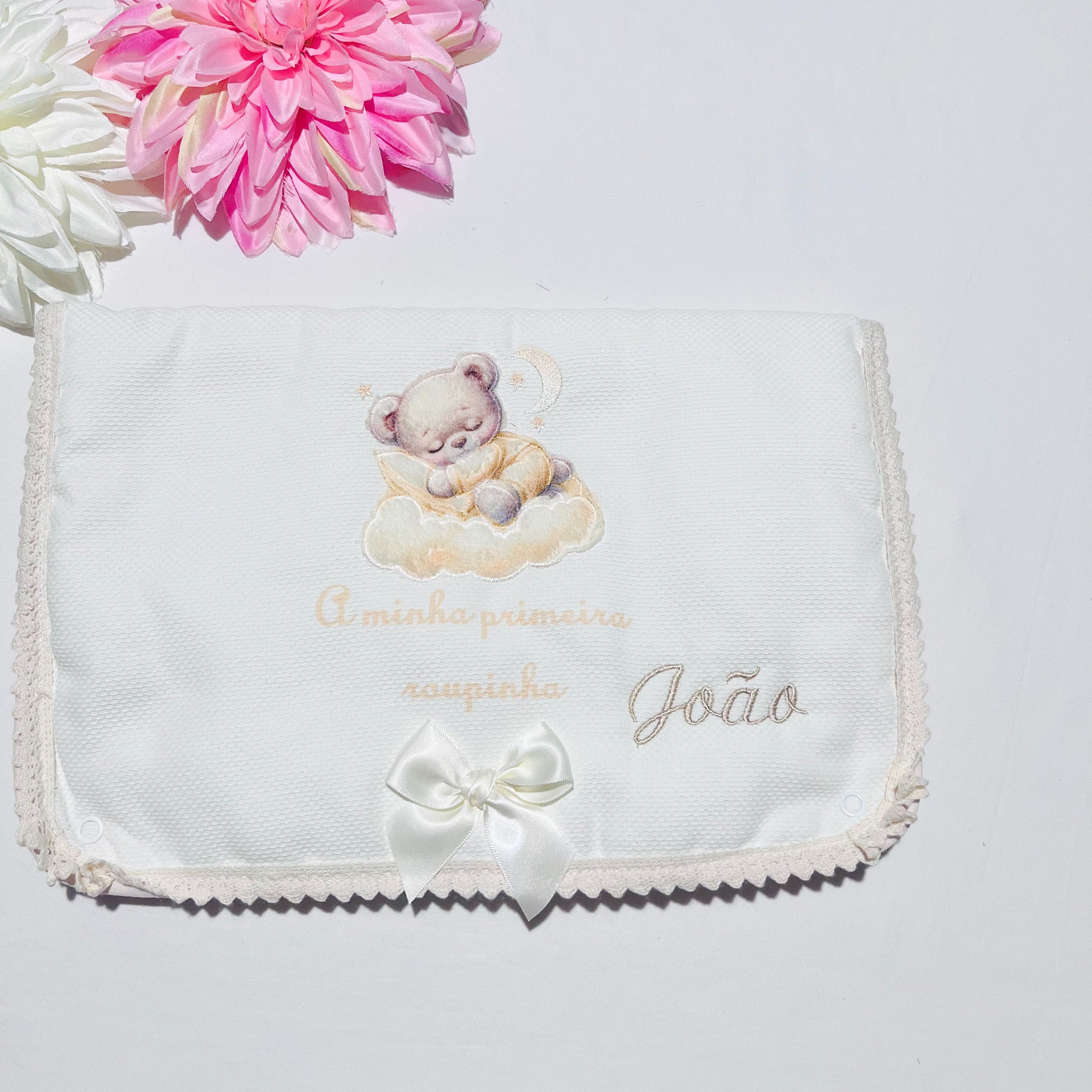 Fazemos personalizações em: Mantas, fraldas, toalhas de banho, babygrows, babetes, body interior, body de gola, tapa-ovo, Dou Dou e lençóis sempre com o nome do bebé.