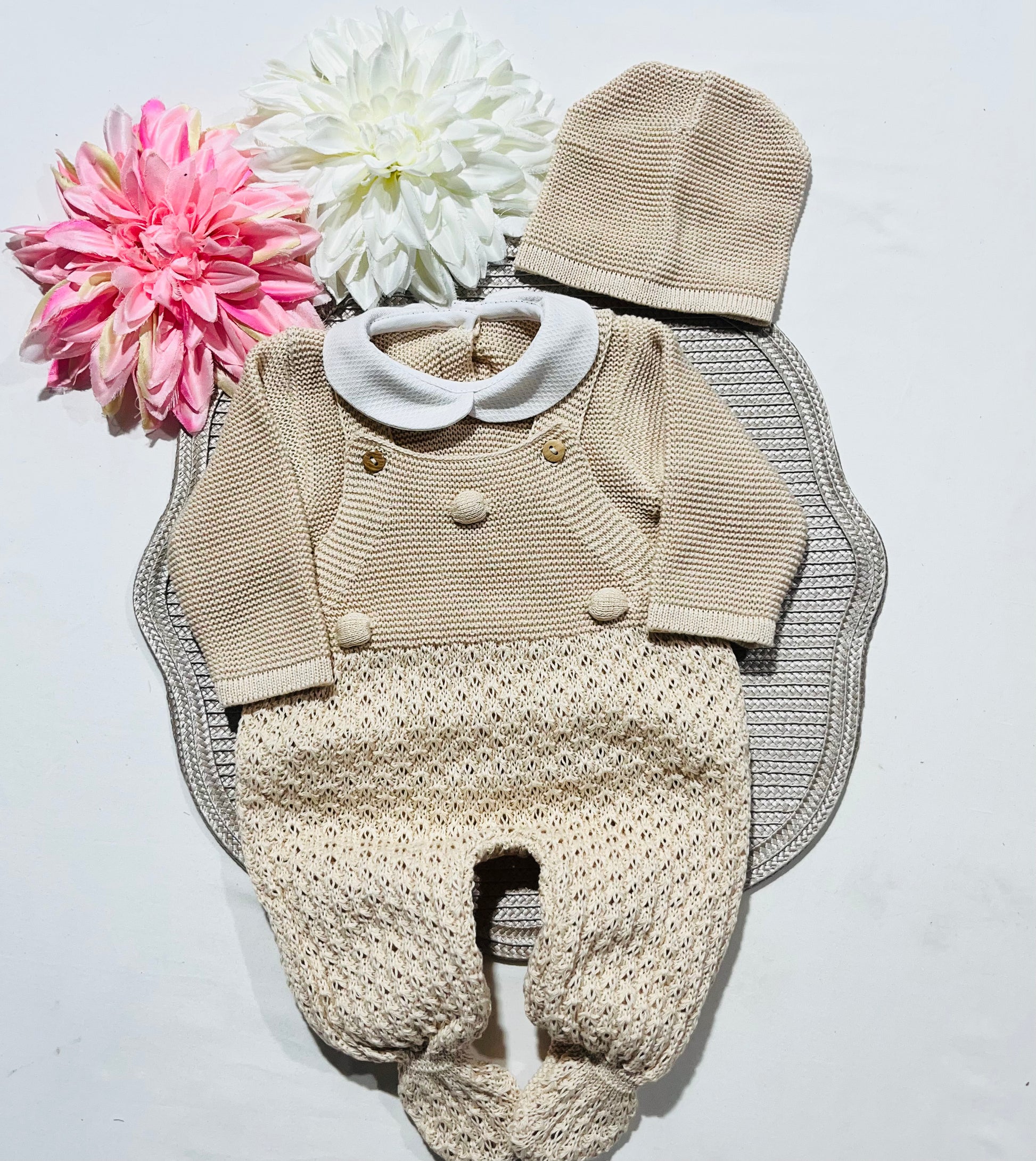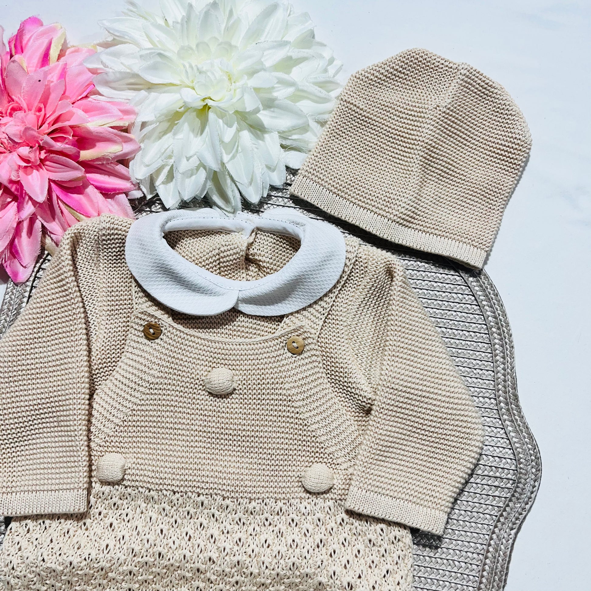 Composto por gorro, camisola com golinha piqué e jardineira com pé