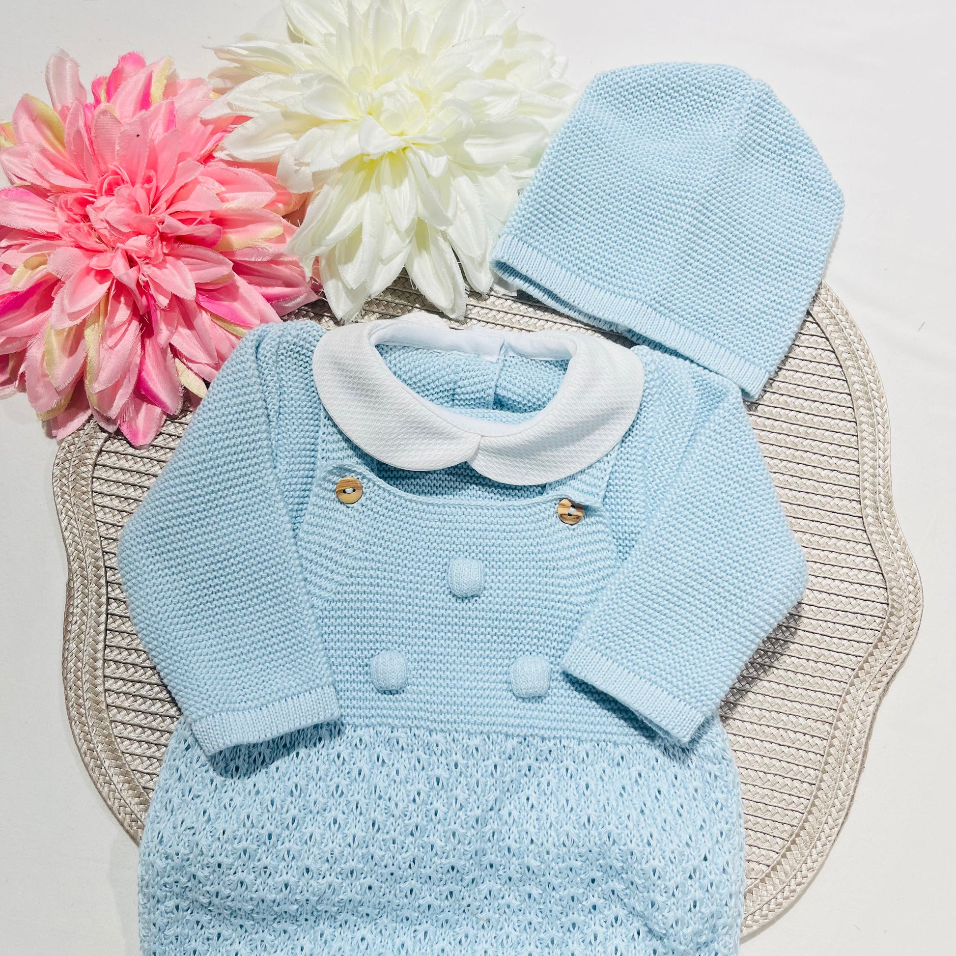 Composto por gorro, camisola com golinha piqué e jardineira com pé