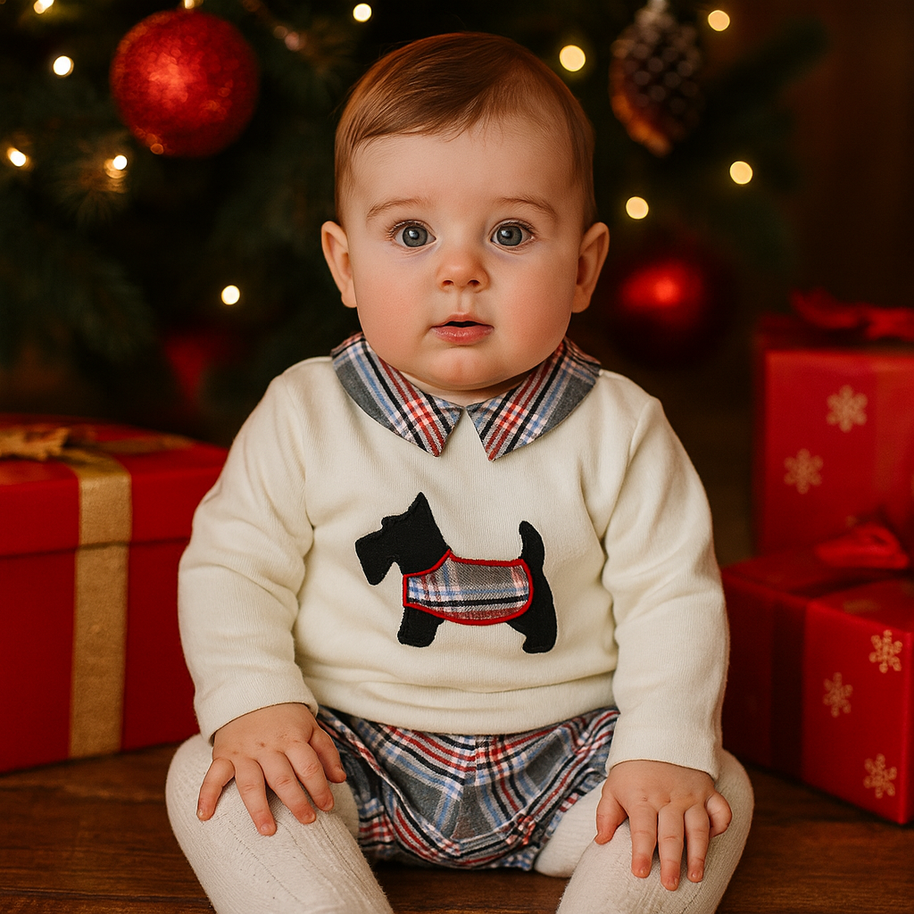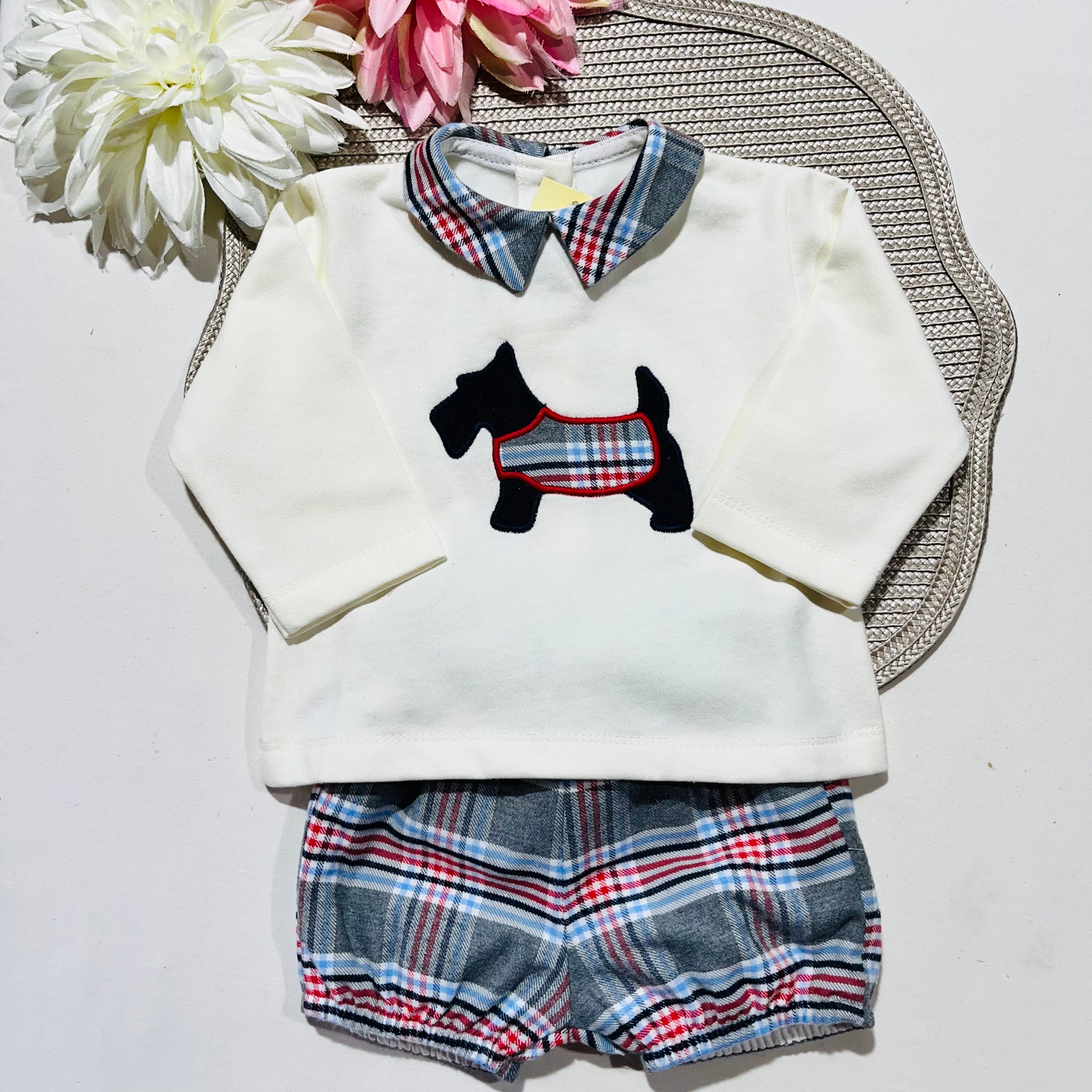 Composto por camisola de gola com carda e calção xadrez forrado.