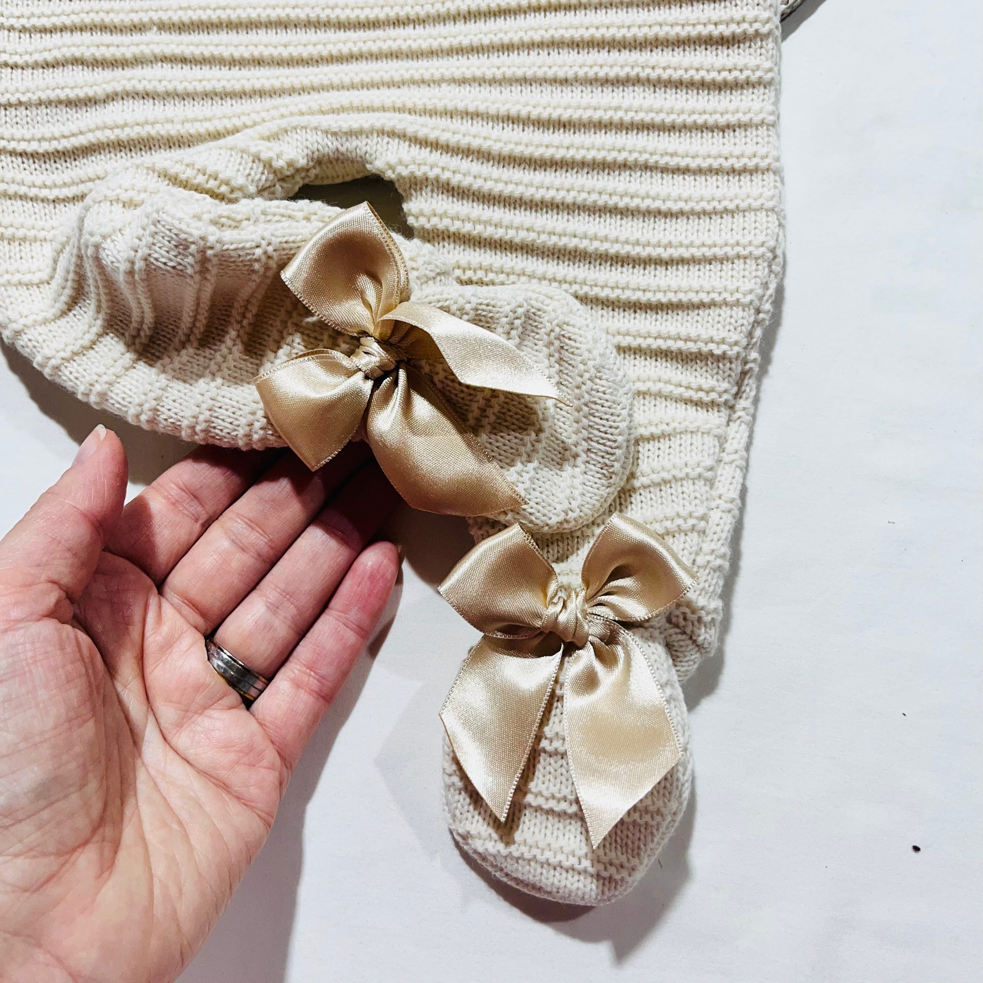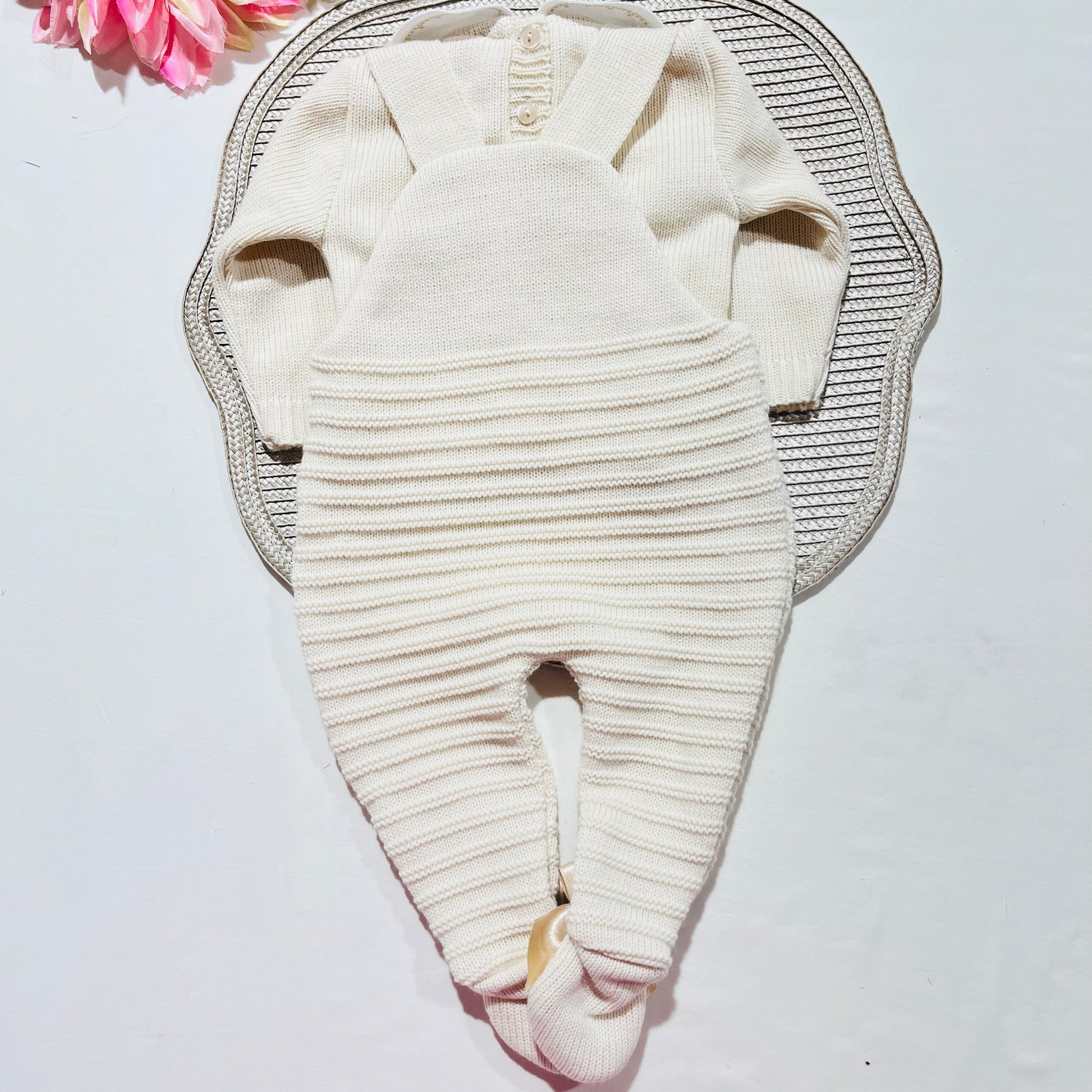 Composto por: Camisola com gola de tecido que abotoa atrás e jardineira com pé com laço