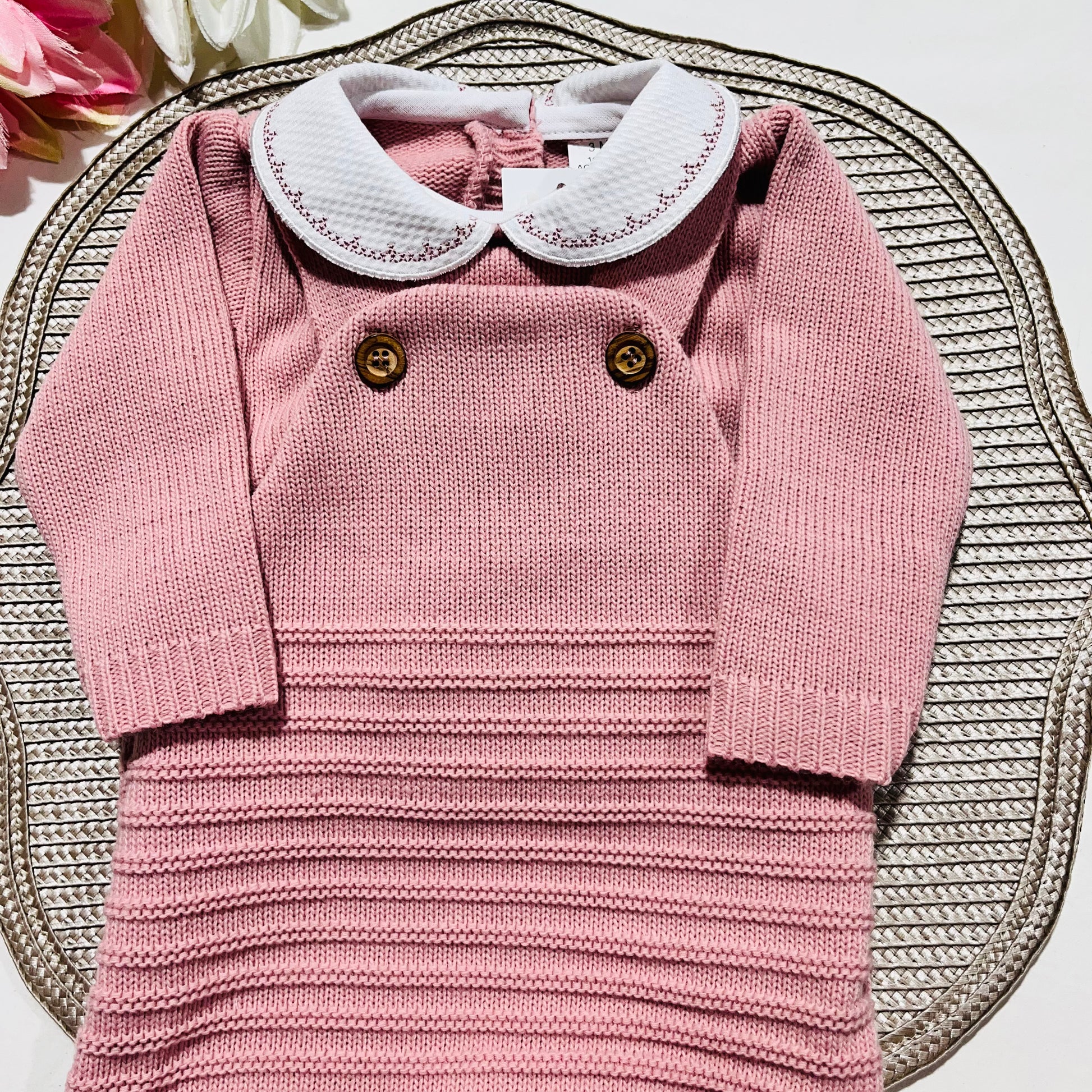Composto por: Camisola com gola de tecido que abotoa atrás e jardineira com pé com laço