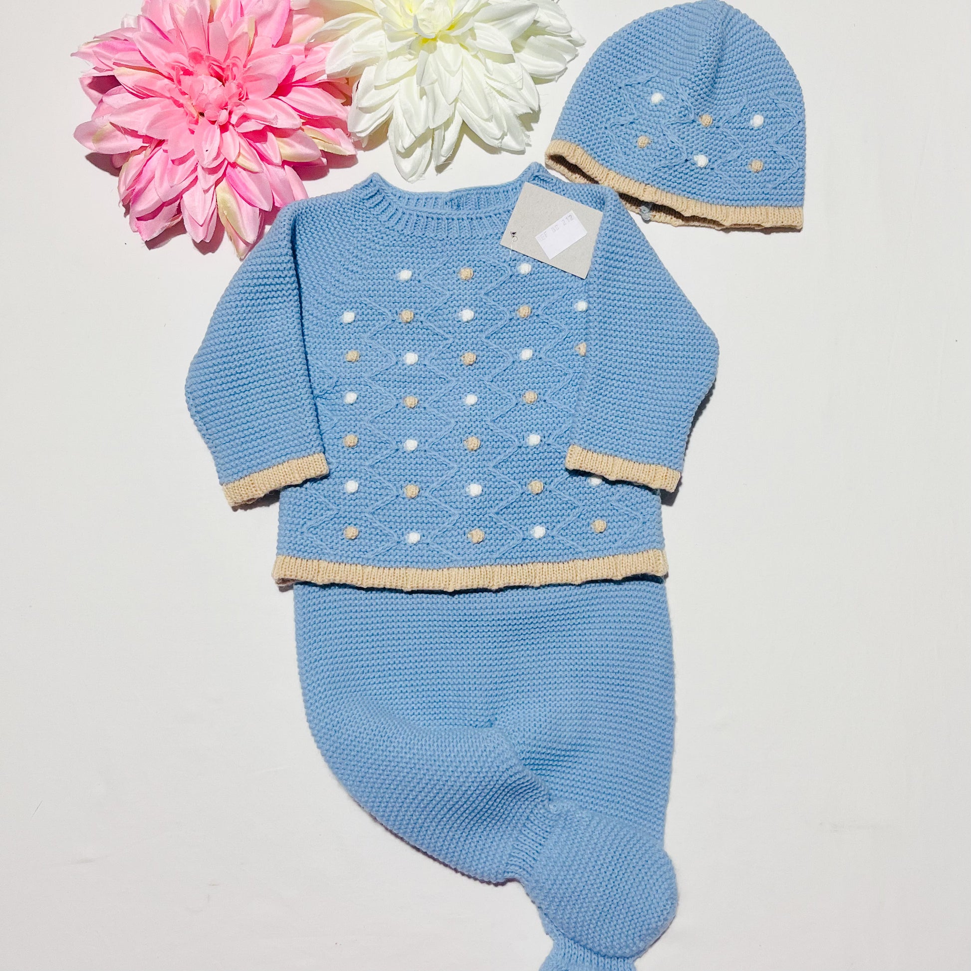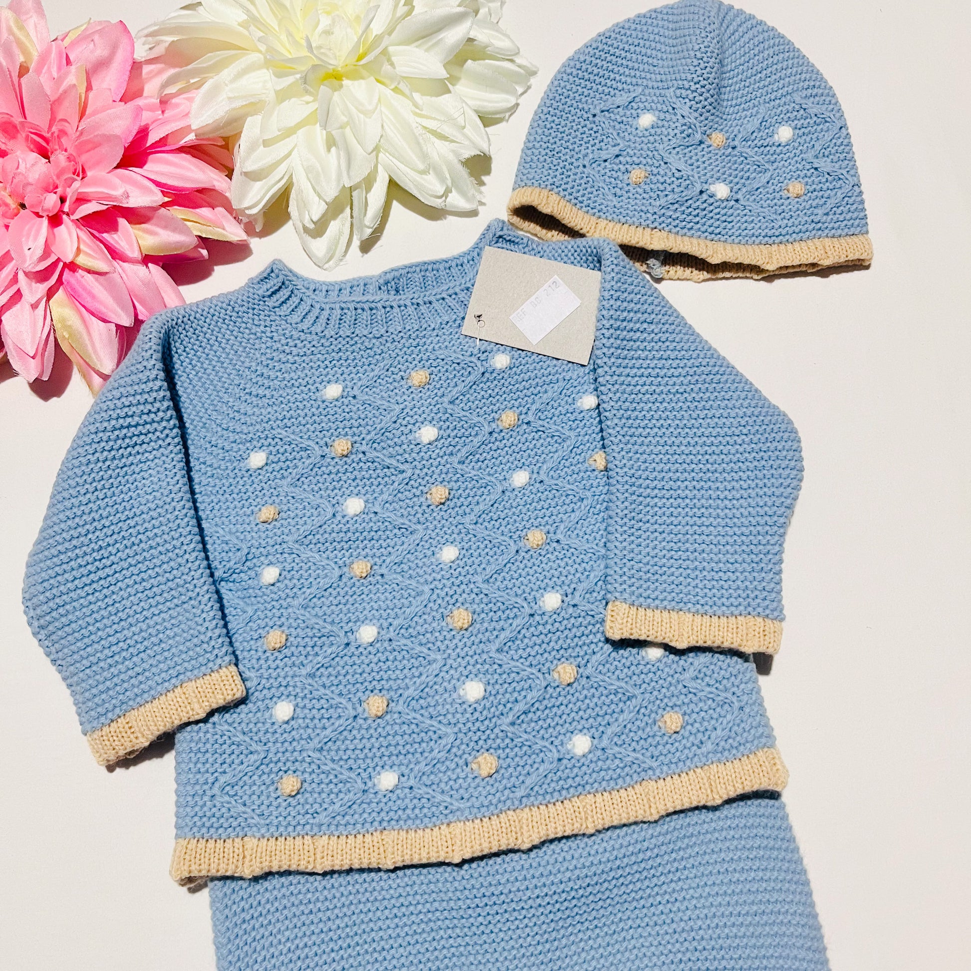 Conjunto muito bonito composto por camisola, calça e gorro.