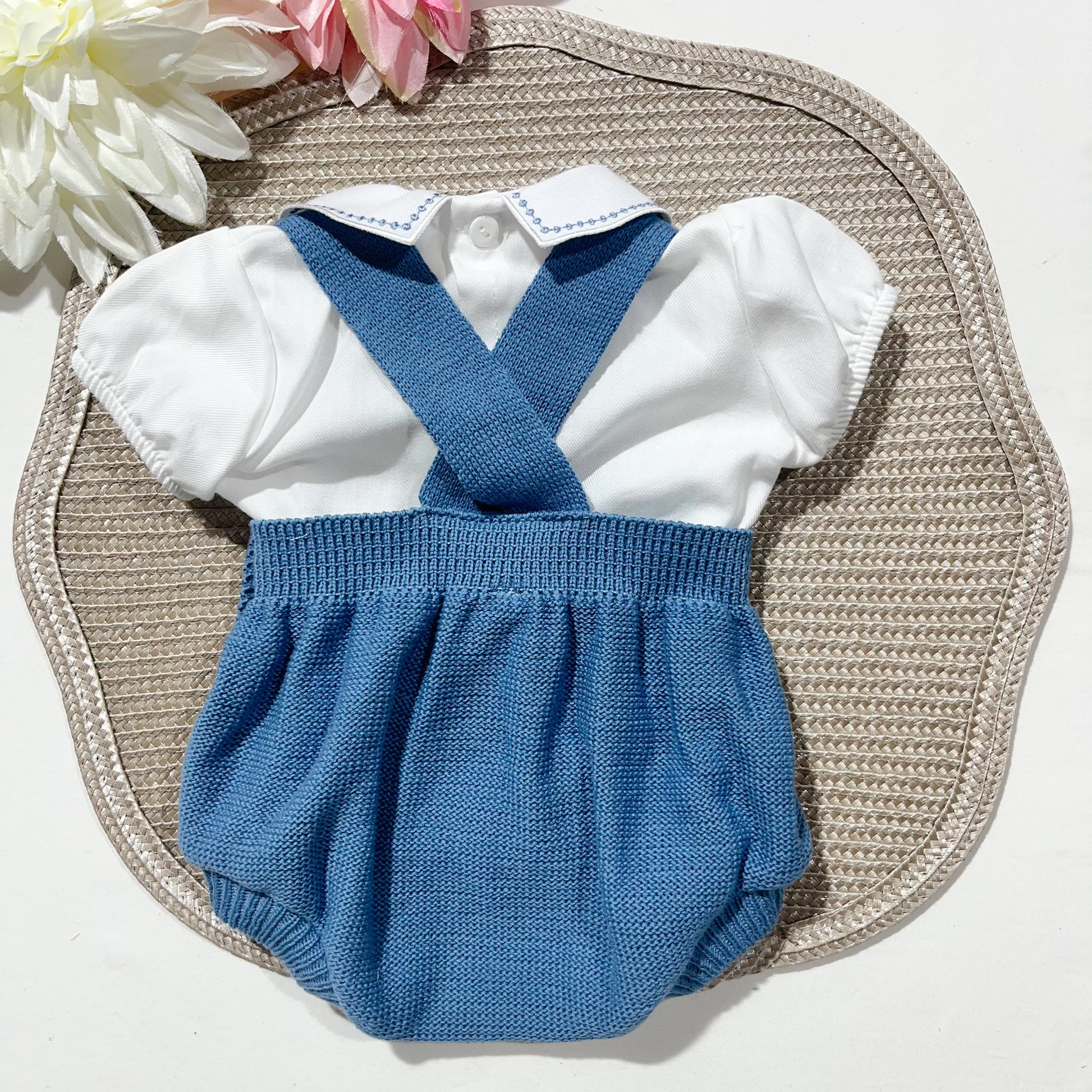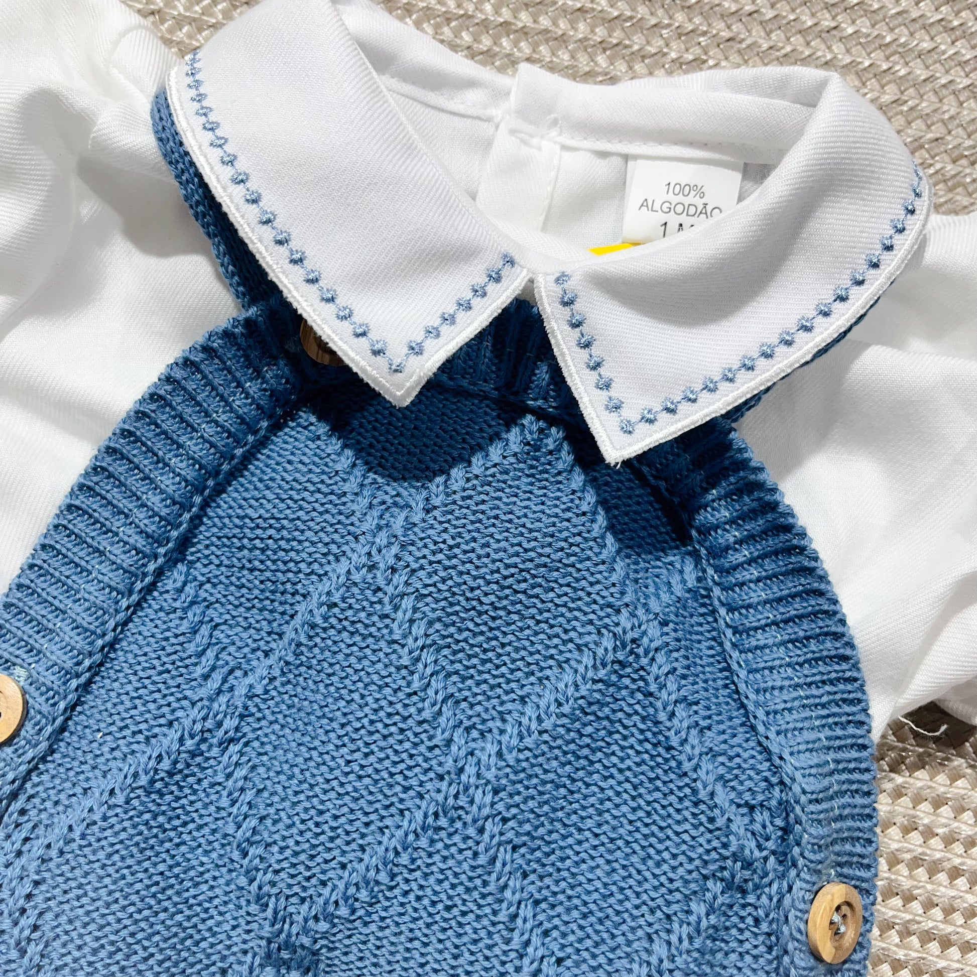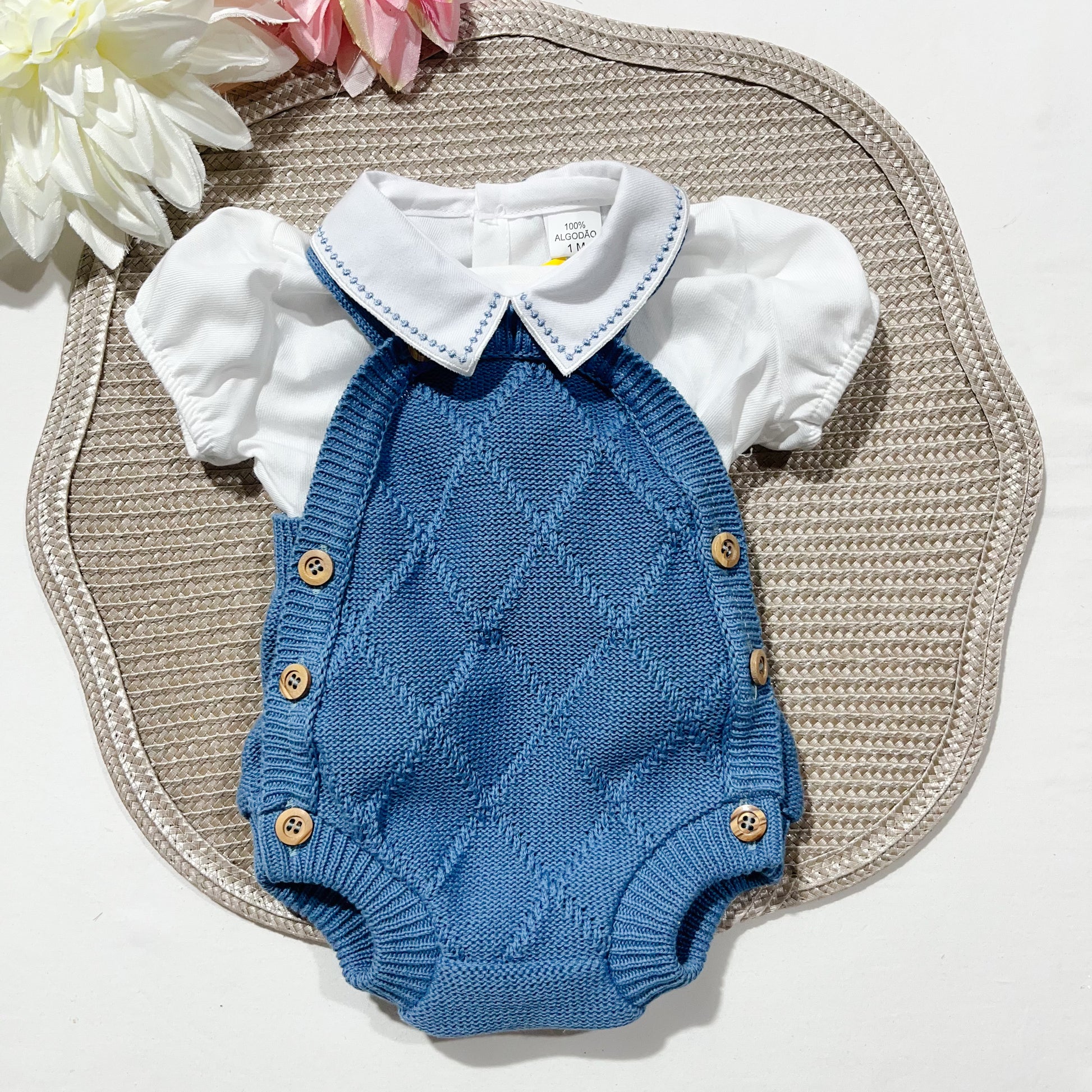 Composto por fofo de alças que abotoa na frente em todo o comprimento e camisa de manga curta com gola de bico