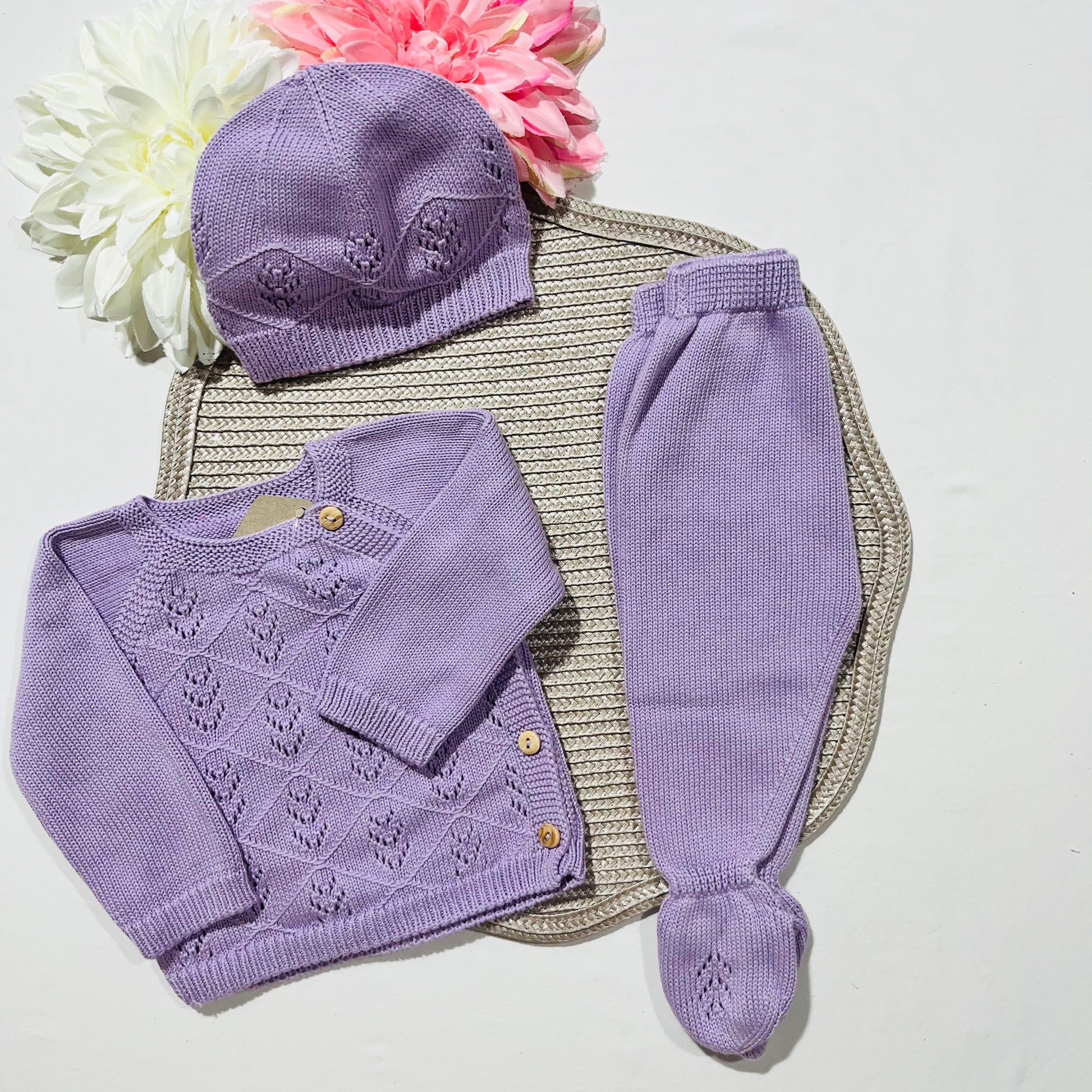 Conjunto de 3 peças muito bonito com malha trabalhada.