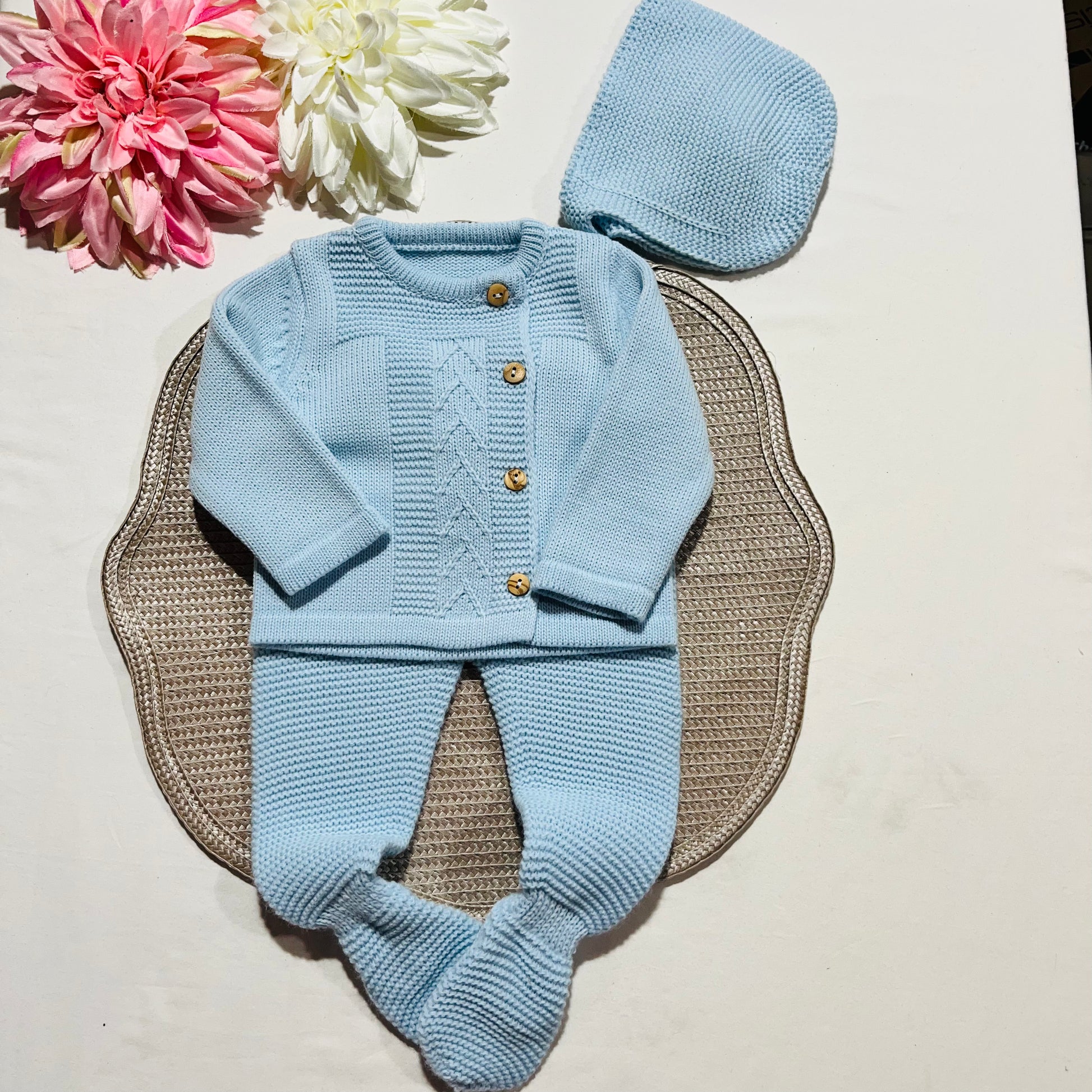 Conjunto de malha para bebé - 3 peças -1/3M e 3/6M - Azul