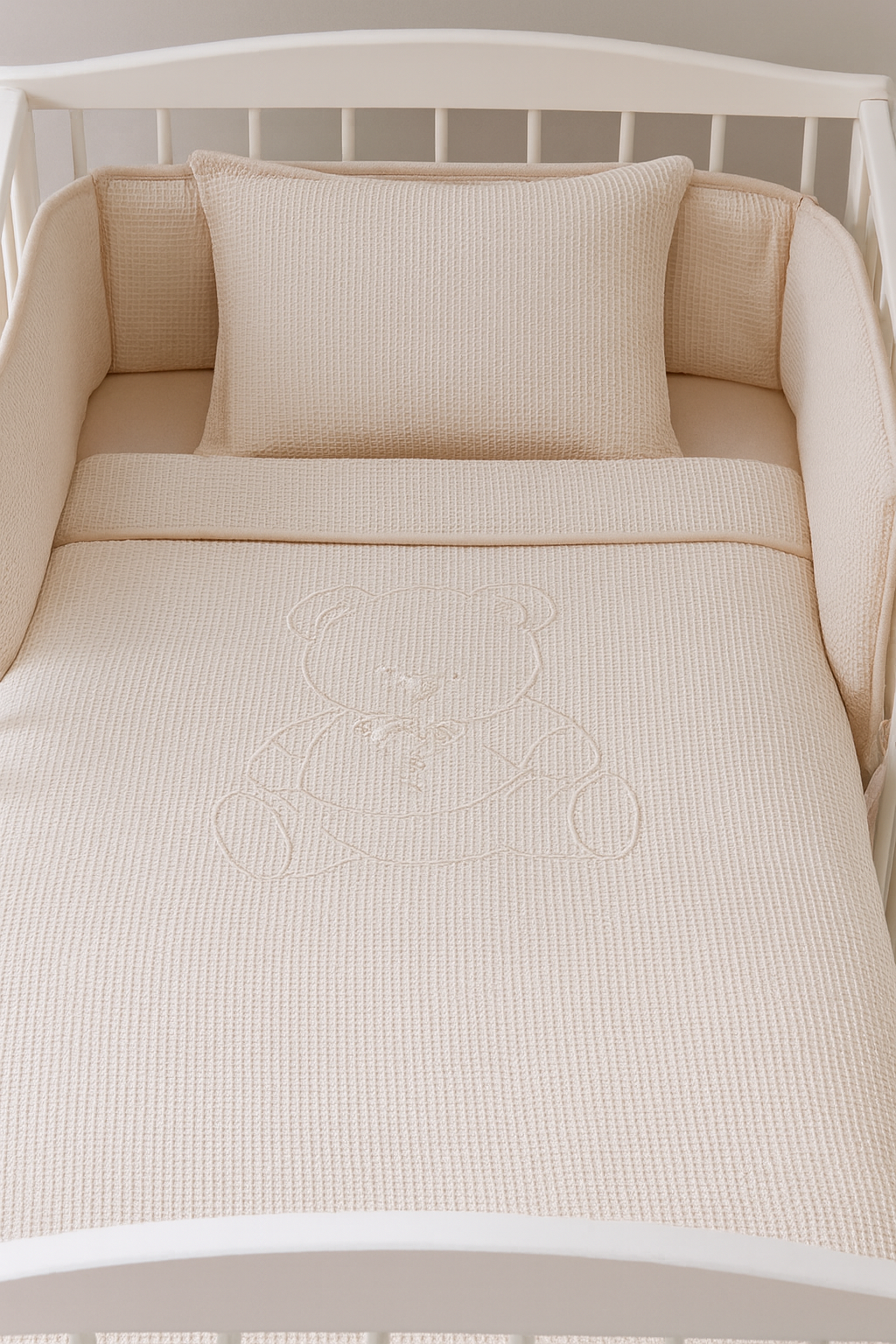 Um lindo conjunto do tema Wafle que vai deixar a cama do seu bebé super fofinha.