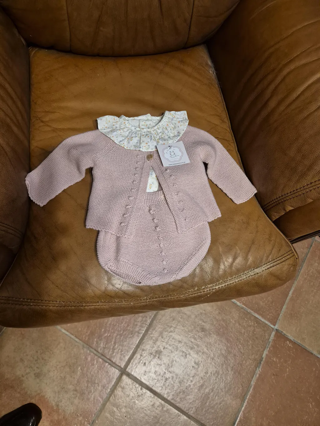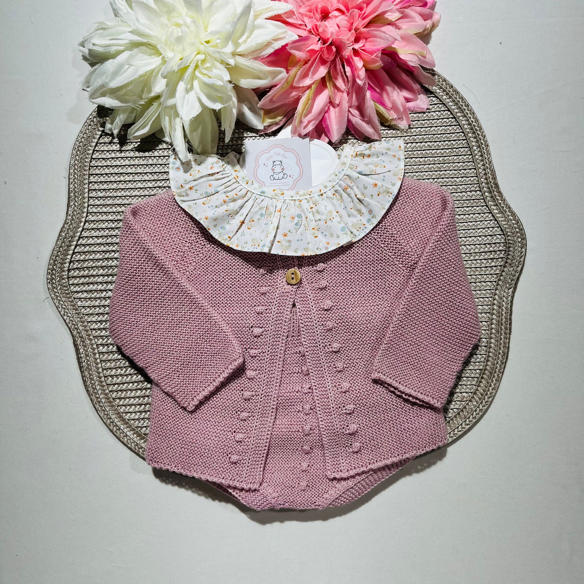 É composto pelo casaco e fofo de alças em malha suave e também a camisa de gola com um padrão floral que abotoa atrás