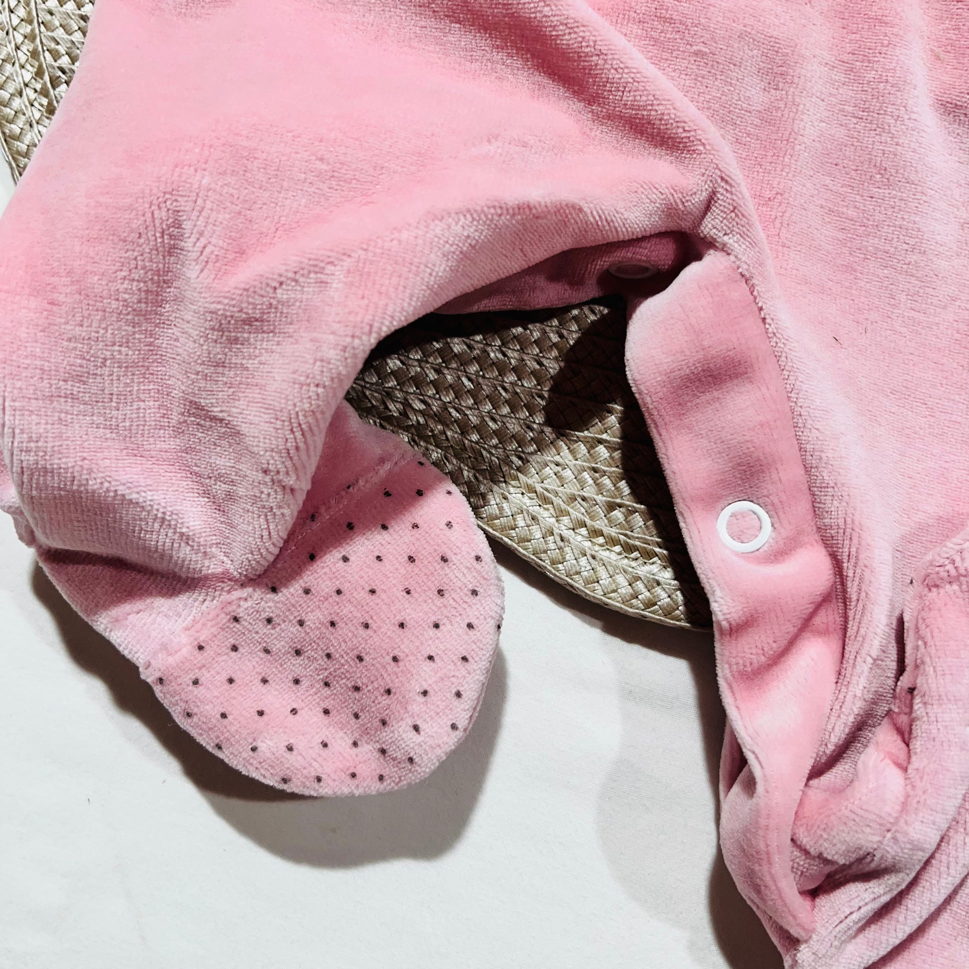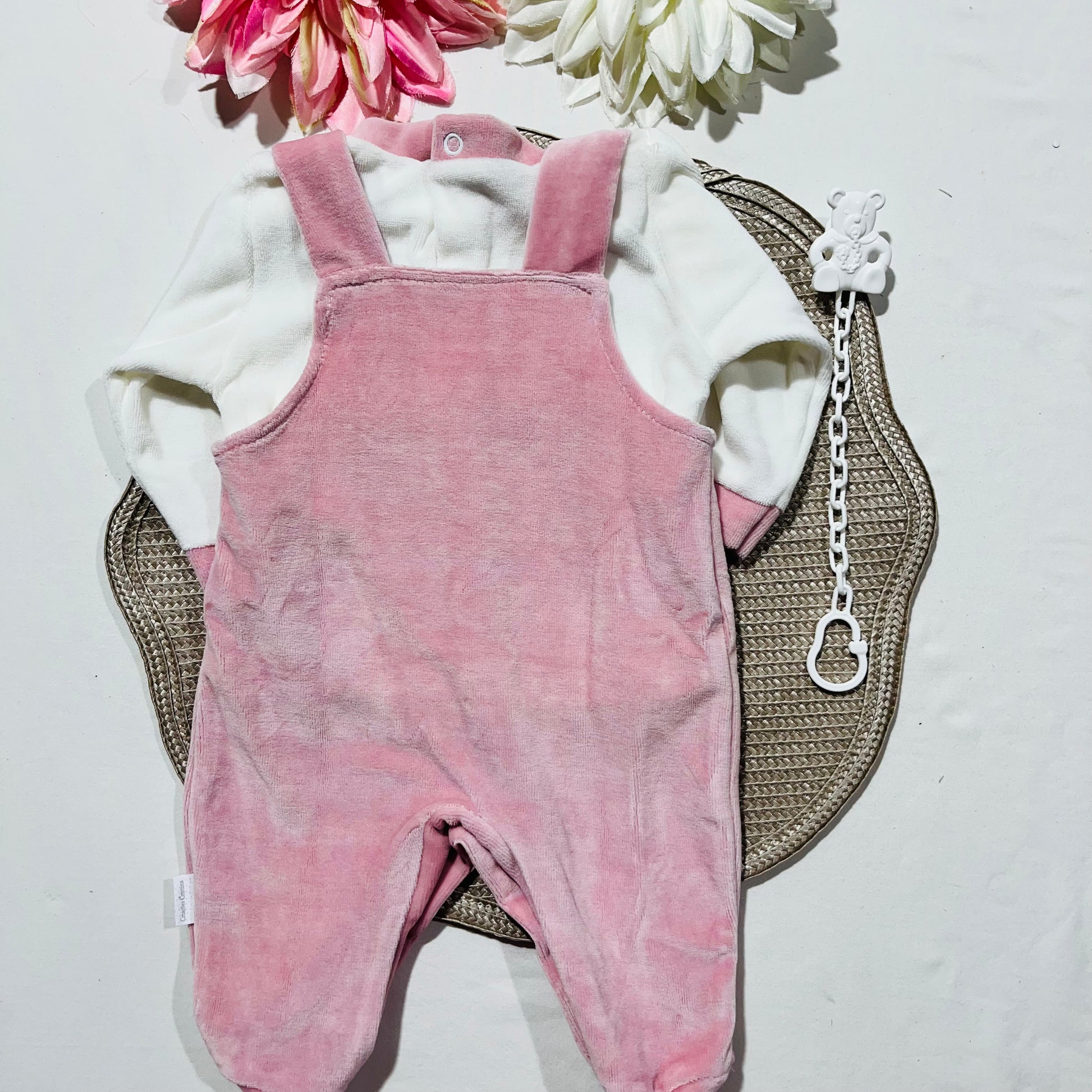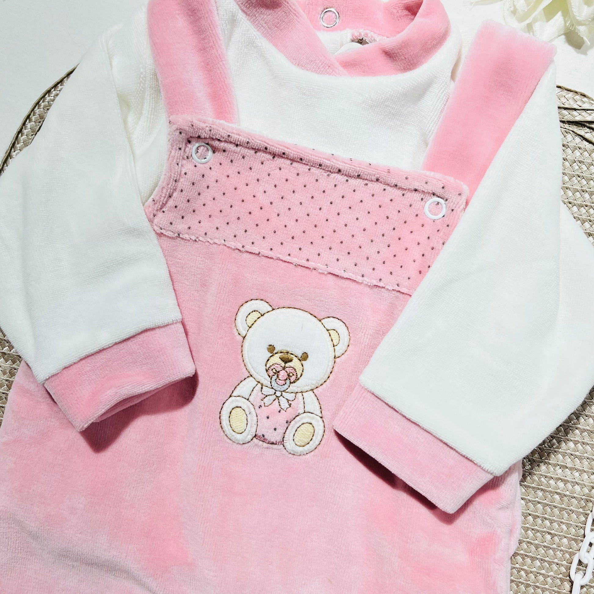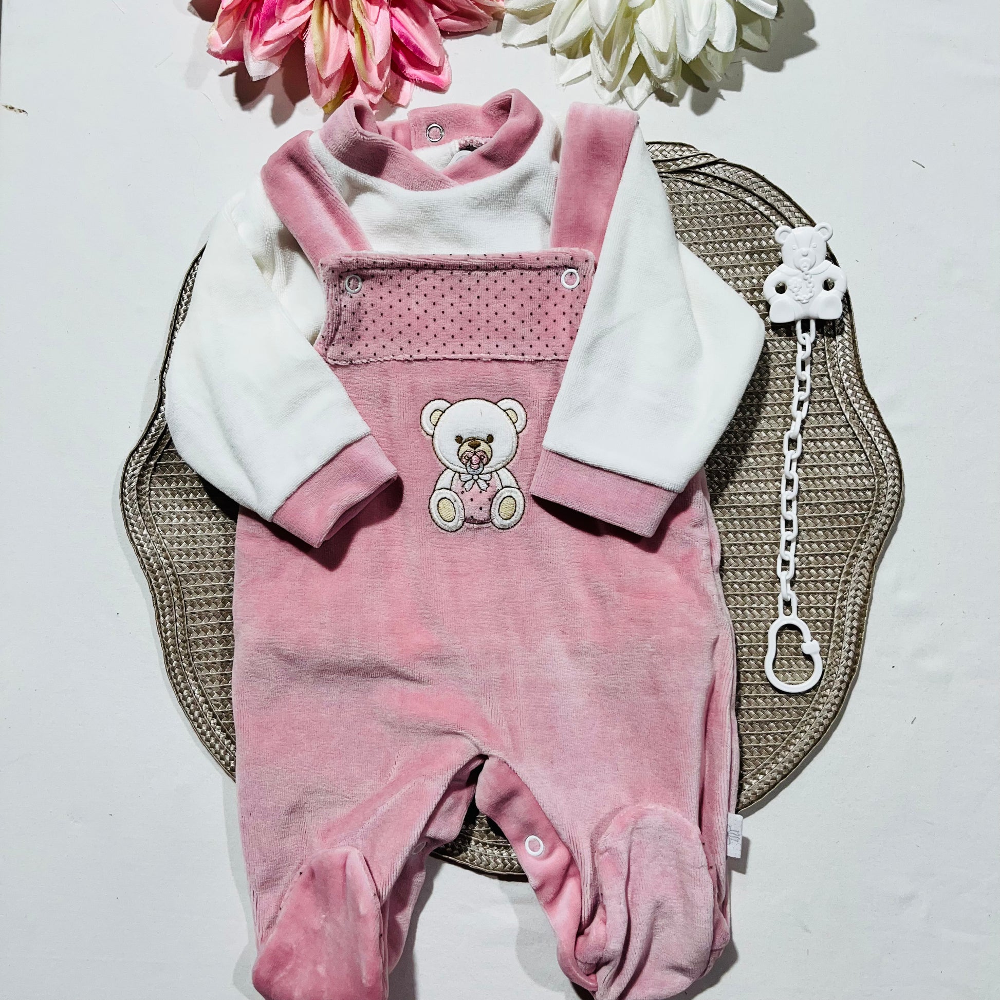 Conjunto jardineira bebé "Ursito" com prende chucha em veludo - Rosa