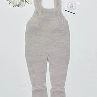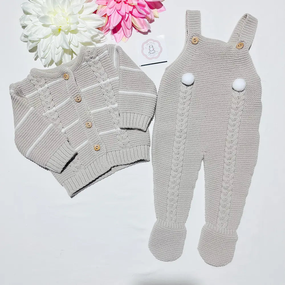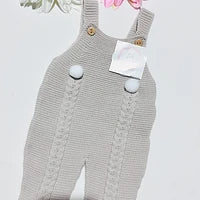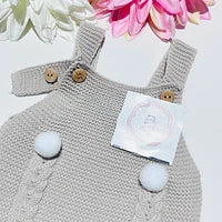 Jardineira com alças reguláveis, abotoa nas alças e têm botões de madeira.