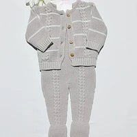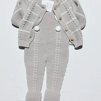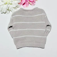 Casaco com listas branca, trabalhado de transa na frente e botões de madeira.