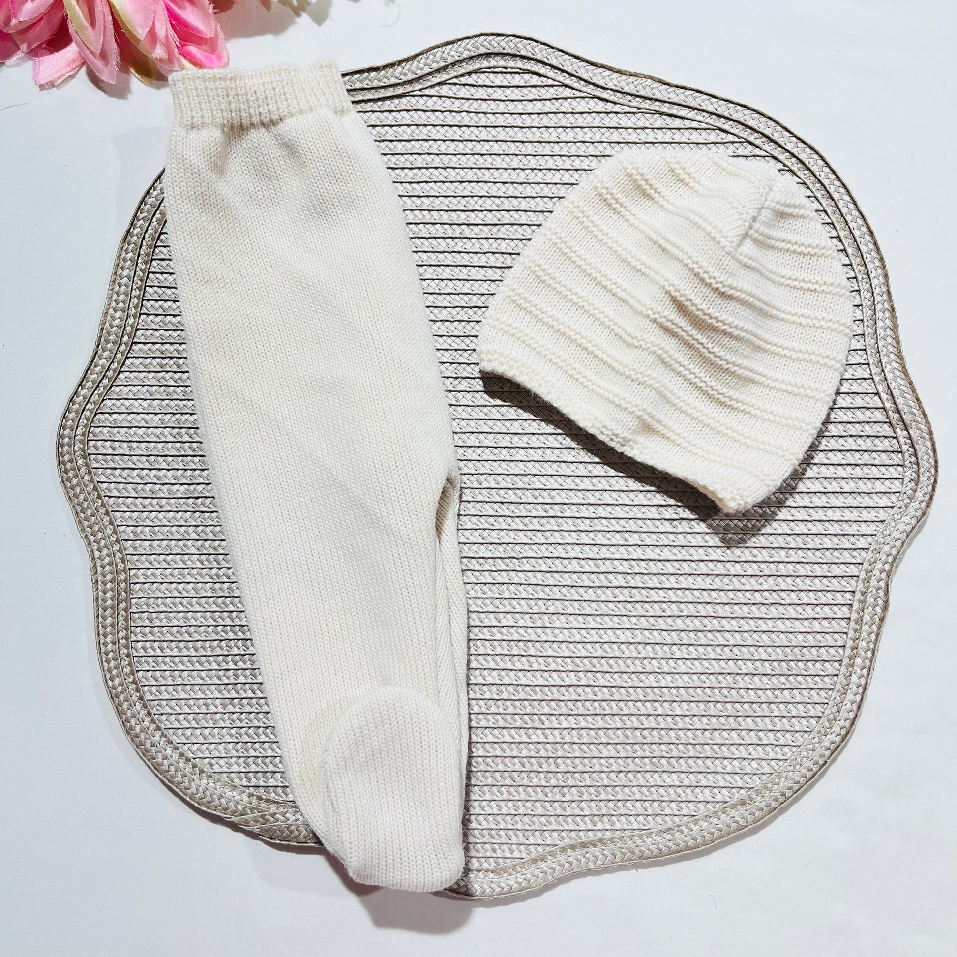 É composto por: Camisola com gola de tecido e botões de efeite em madeira abotoa atrás, calça e gorro