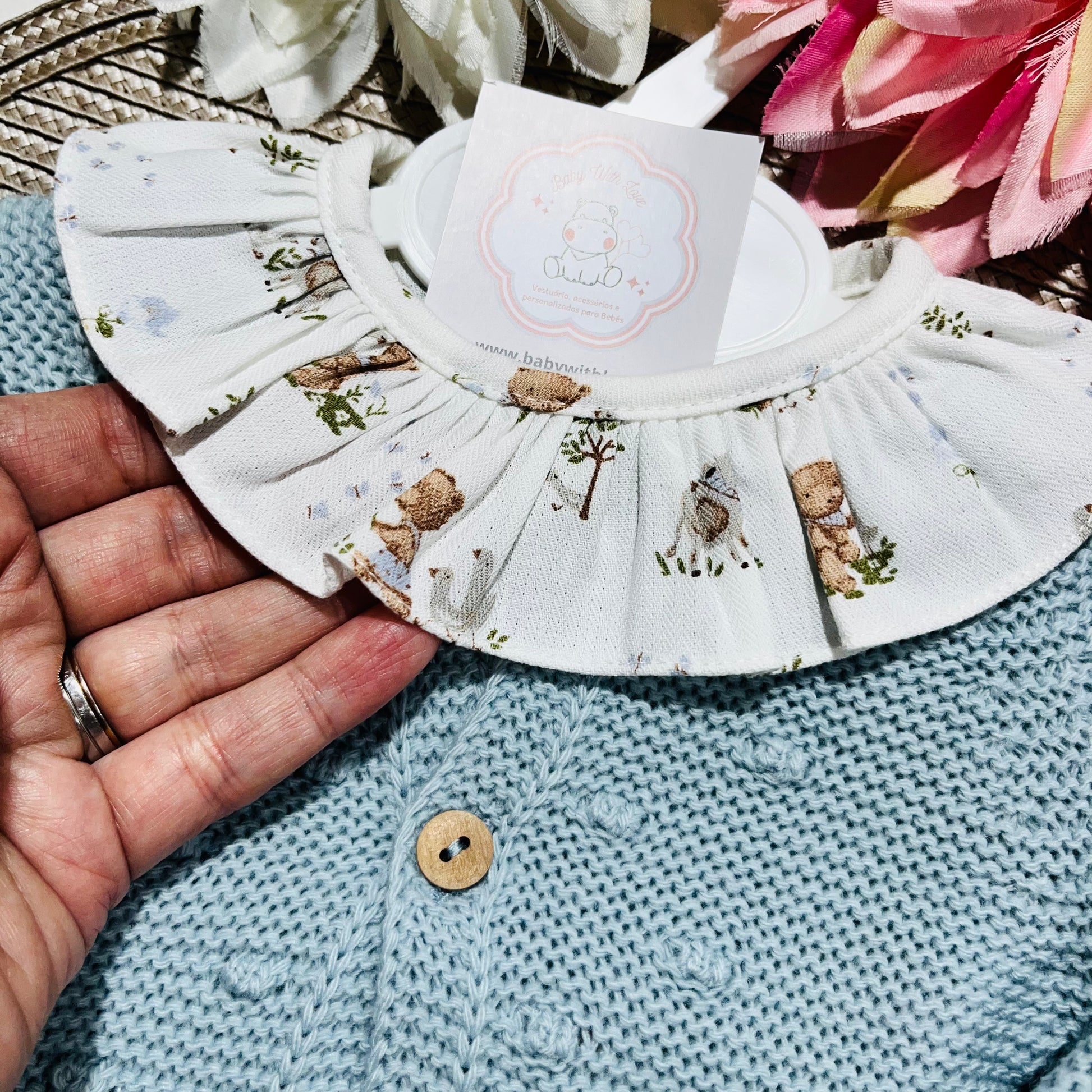 É composto pelo casaco e fofo de alças em malha suave e também a camisa de gola com um padrão Fofinho que abotoa atrás