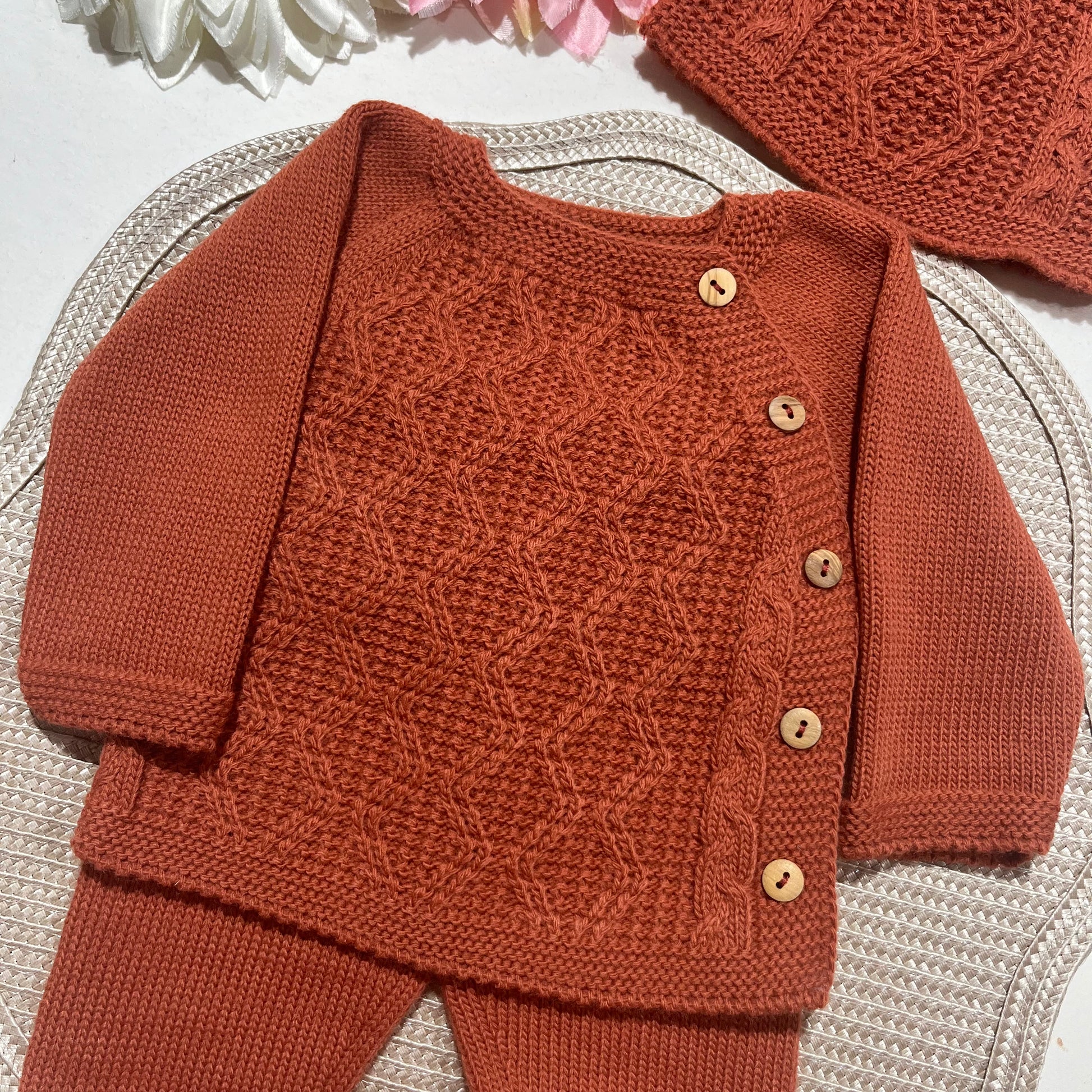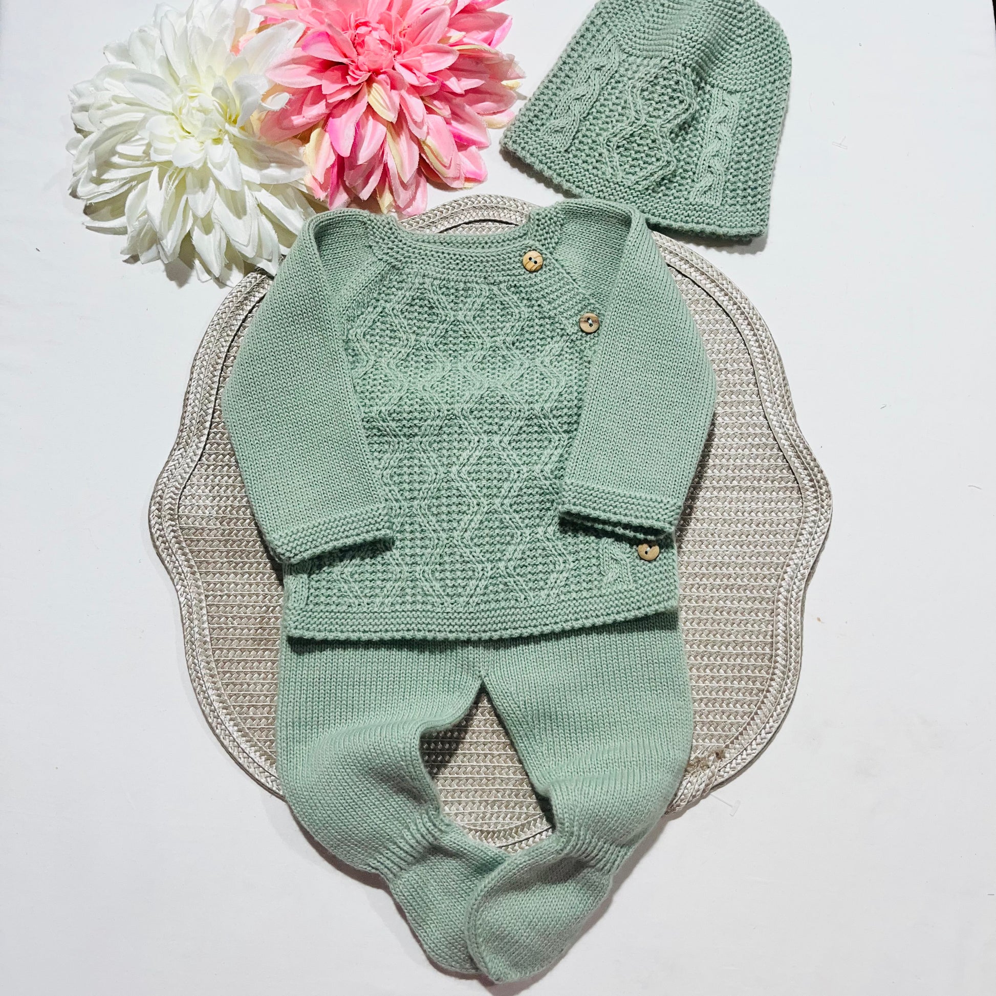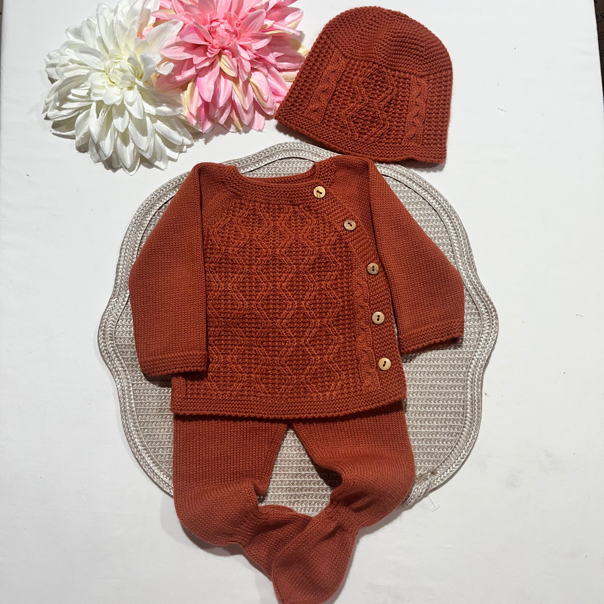 Composto por: Camisola com trabalhado que abotoa na frente, calça e gorro