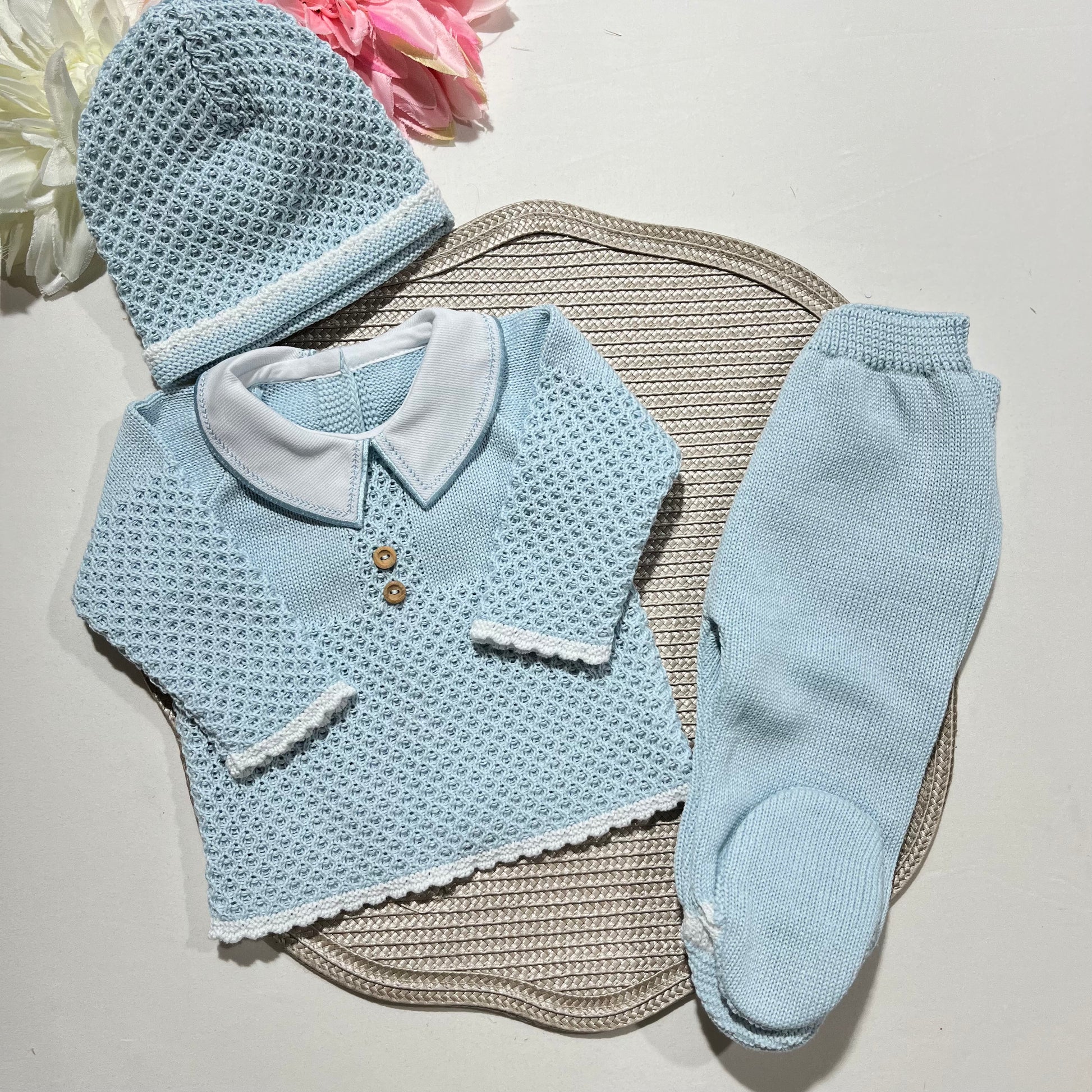 Conjunto composto por: Blusa com a gola em bico que abotoa atrás, calça com pé e gorro, é um conjunto super completo.