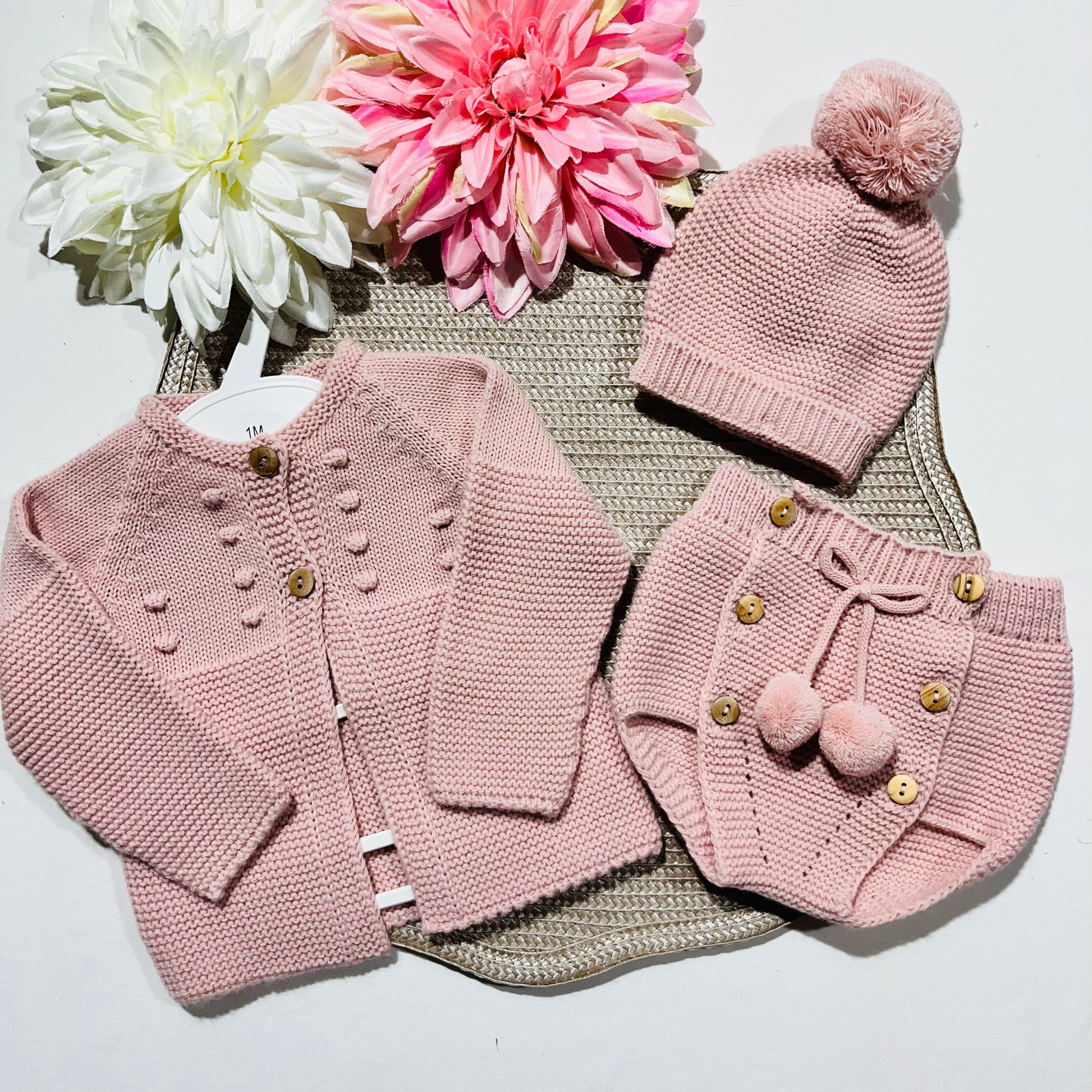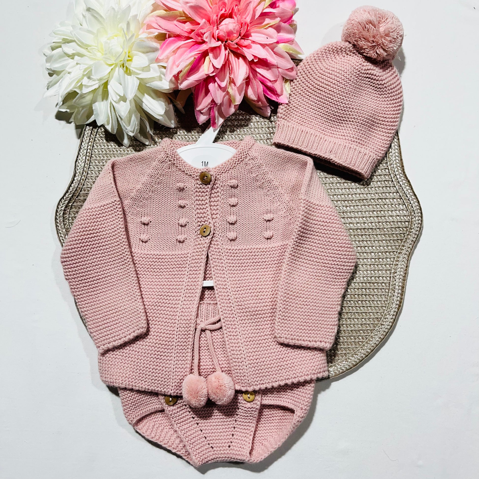Conjunto saída de maternidade para bebé - Casaco, tapa-fraldas e gorro - Rosa