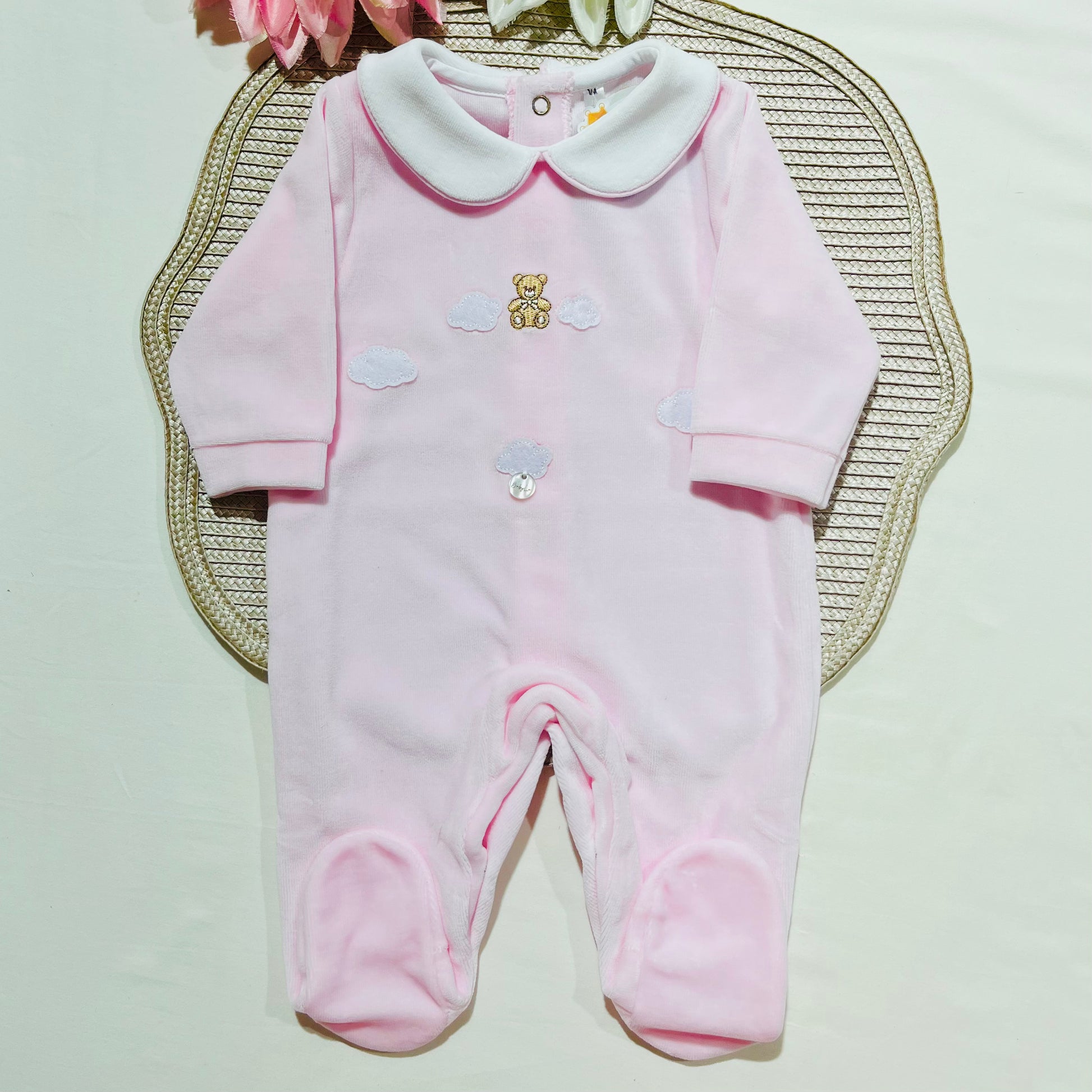 Composto por Babygrow ursinho em veludo que abotoa atrás, manta polar e fralda