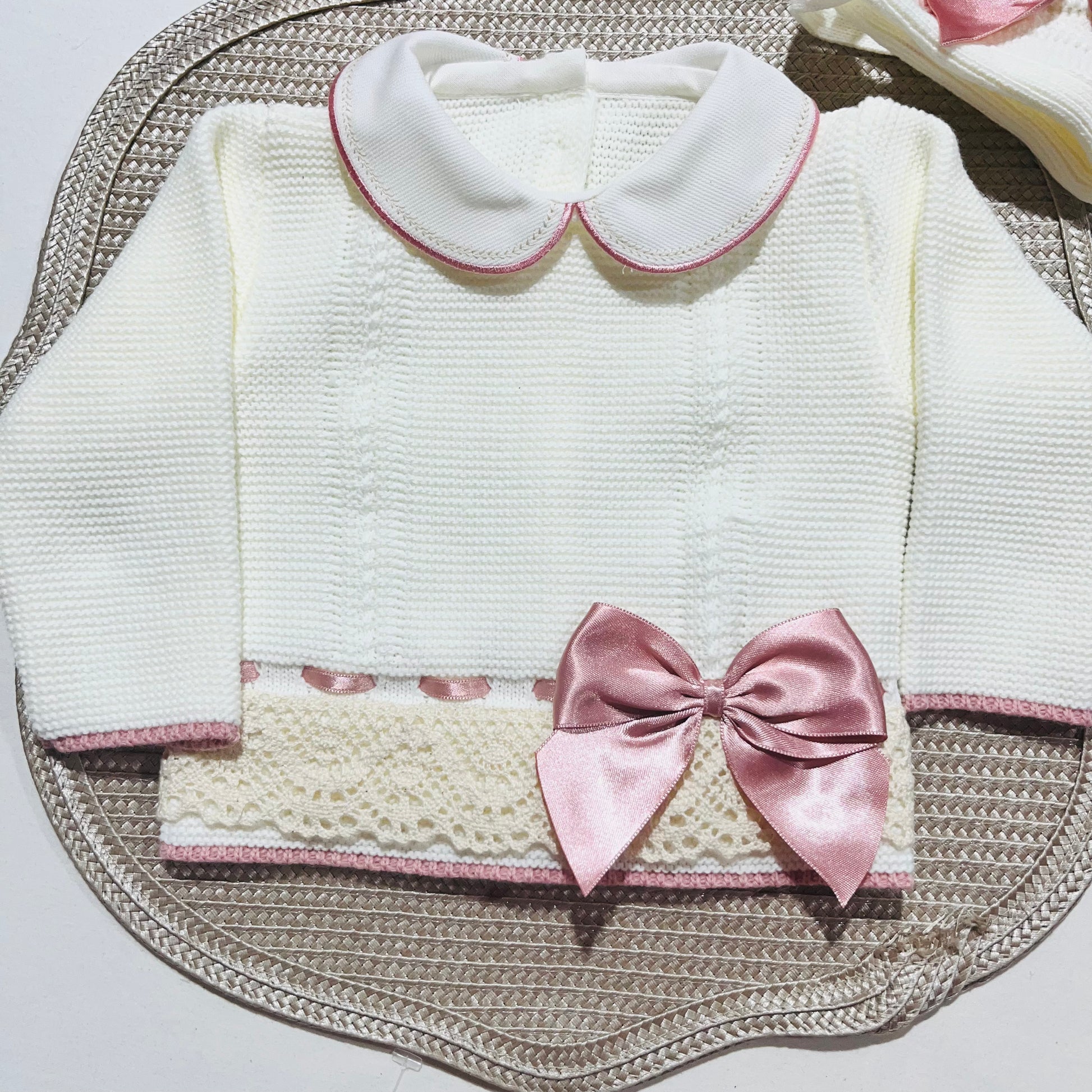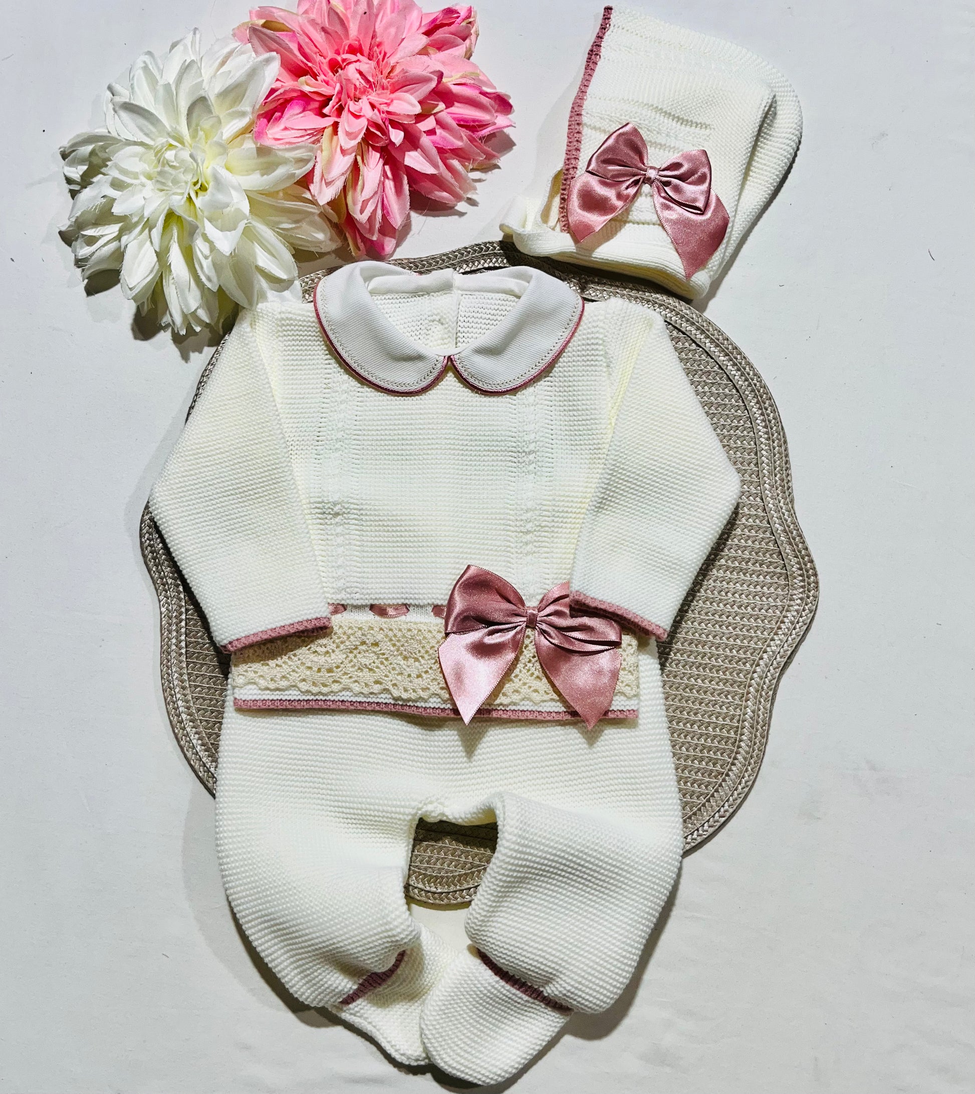 Confeccionada em malha suave de inverno, este conjunto é uma linda sugestão para saída de maternidade, apresenta um design clássico em tom pérola, com detalhes em rosa velho e um laço de cetim que acrescenta um toque de requinte.