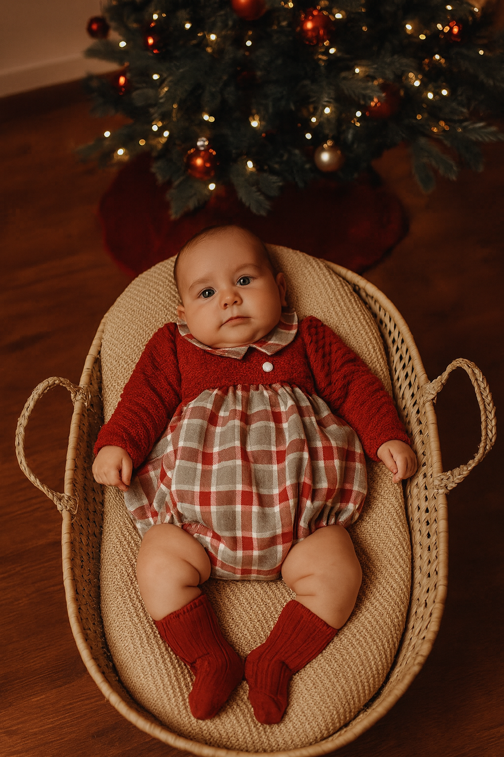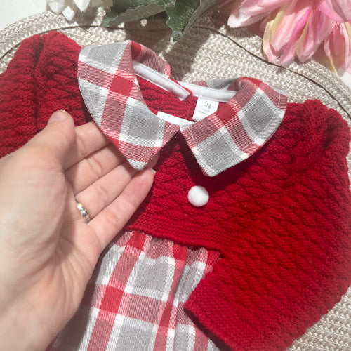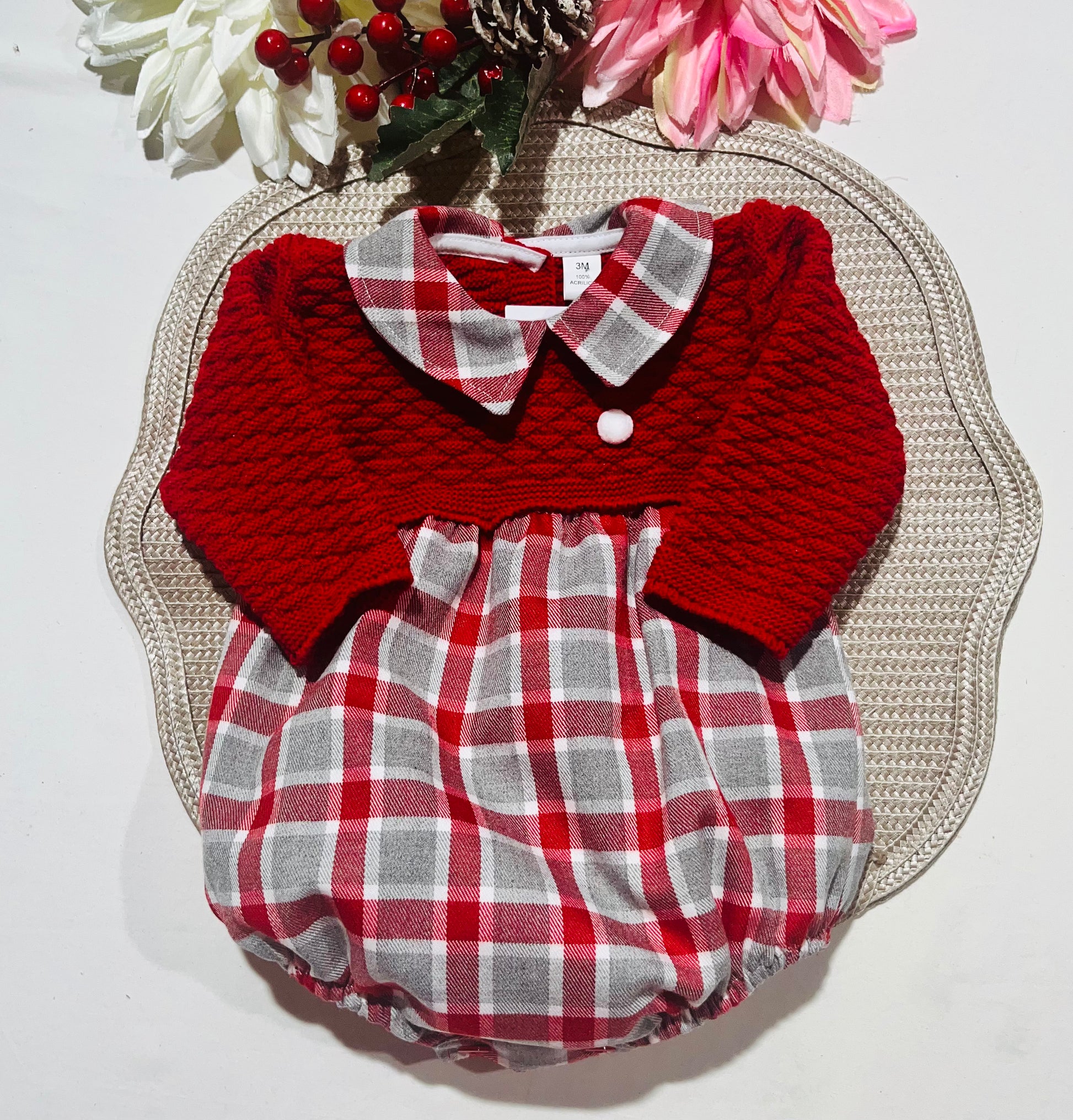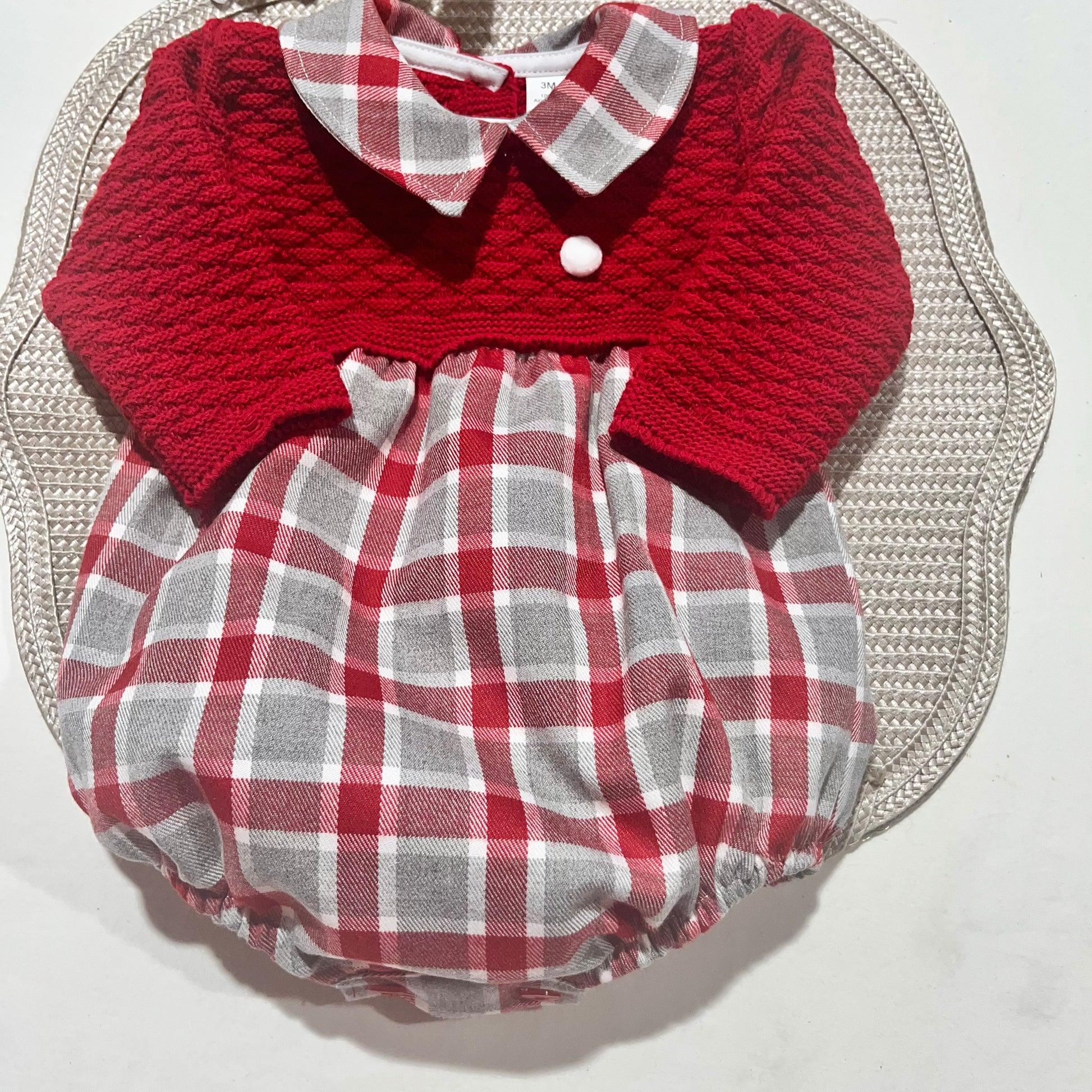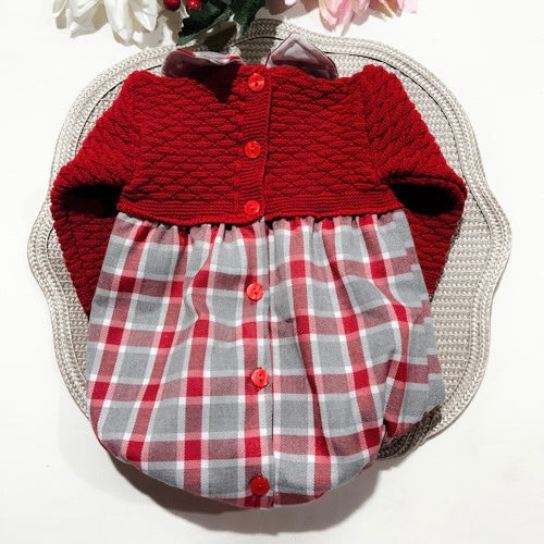 Fofo clássico e encantador com parte superior em malha macia e suave ao toque, e parte inferior em tecido flanela xadrez vermelho e cinza.