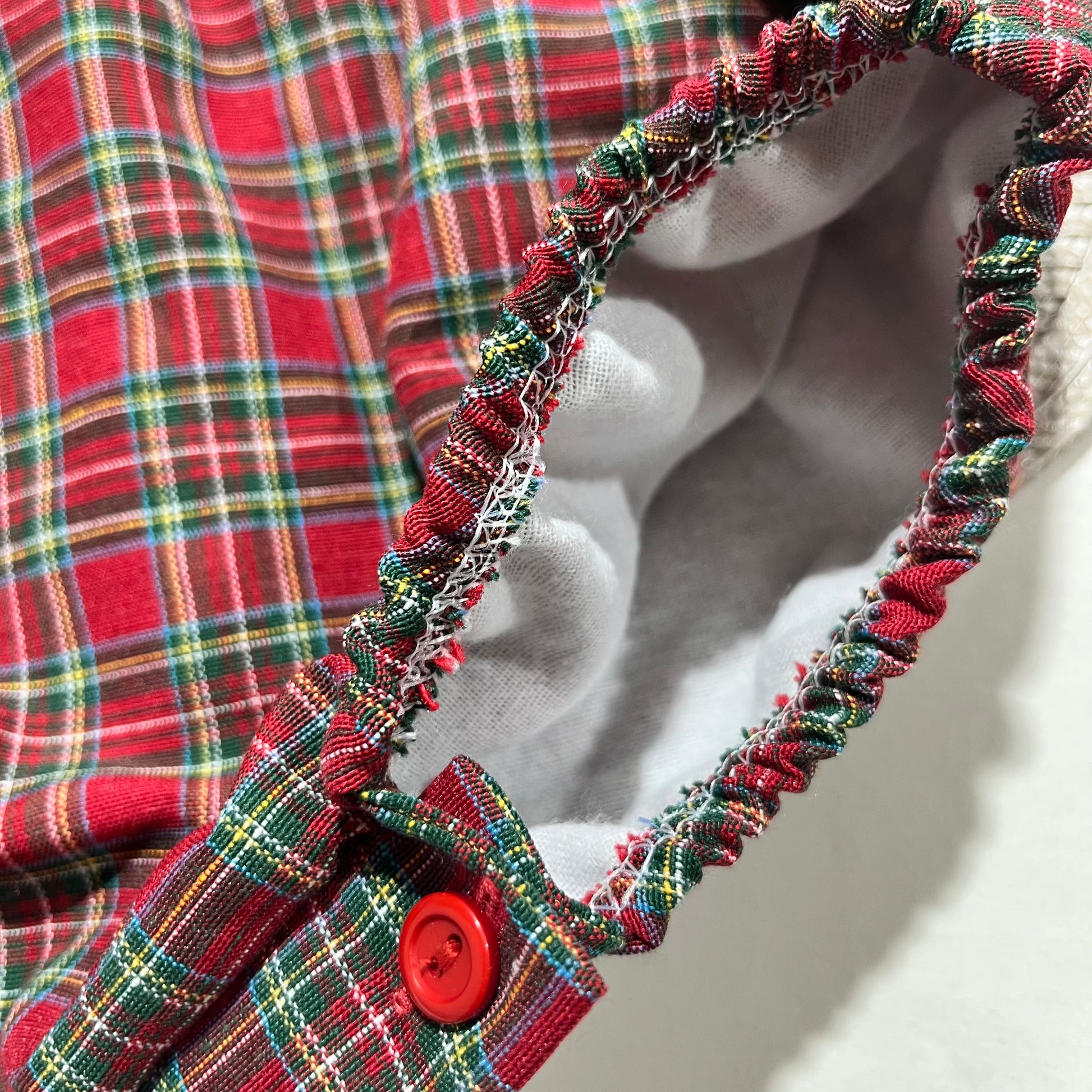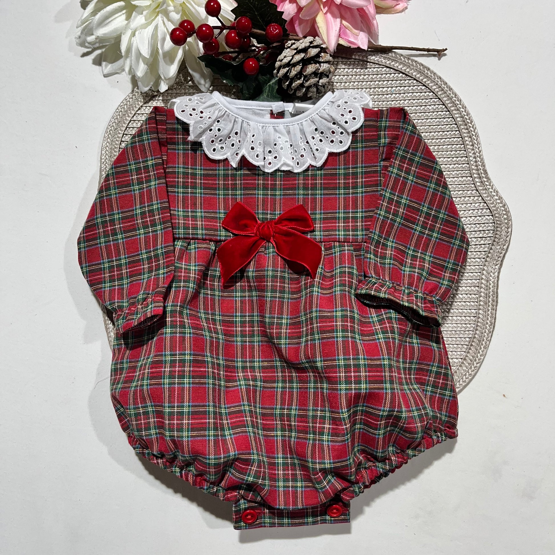 Com um padrão maravilho em tons de vermelho e verde, gola em bordado inglês e laço em veludo.