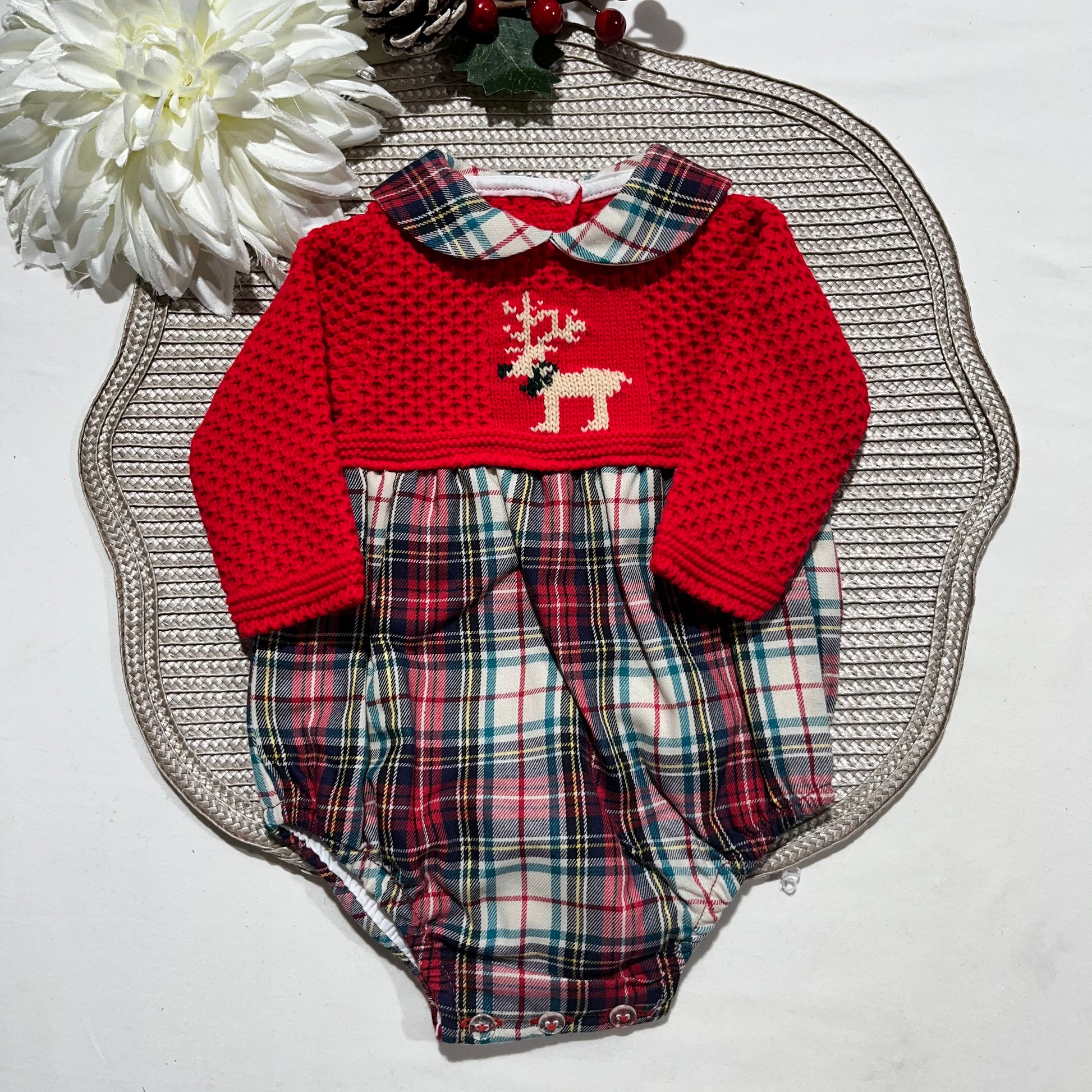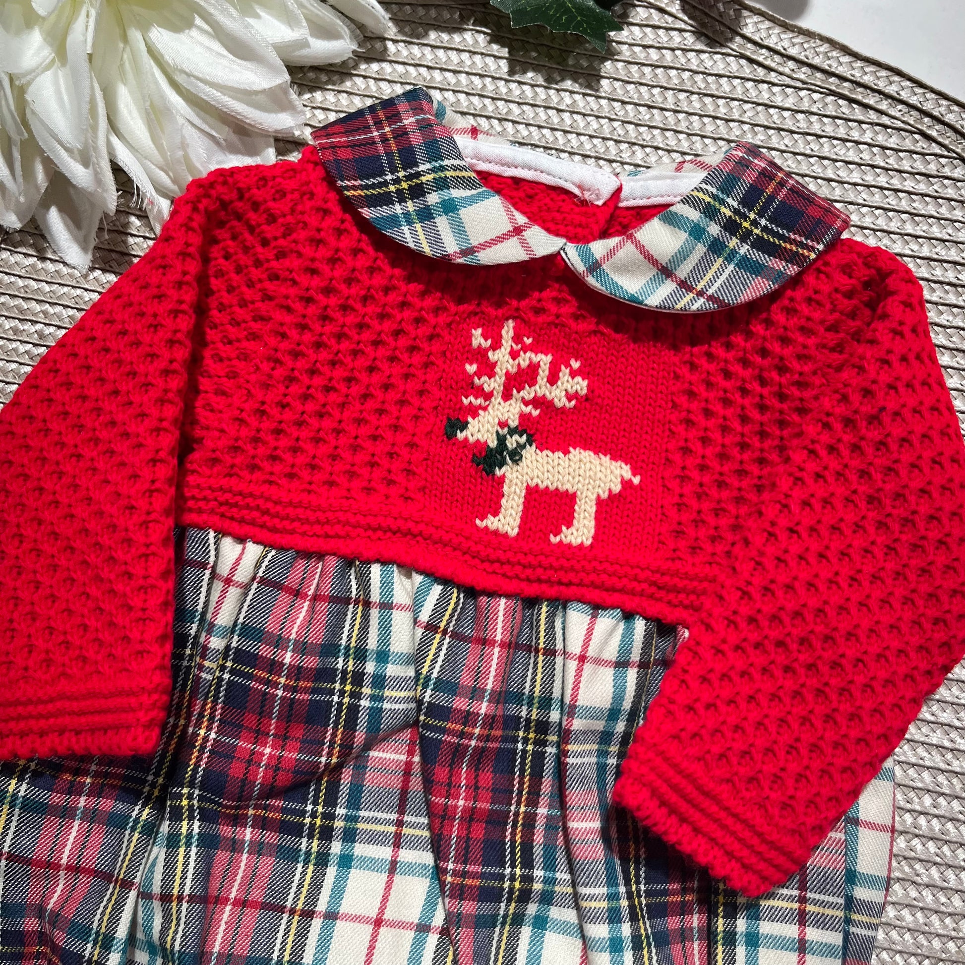 Gola e parte de baixo em tecido com as cores natalícias e peito em malha com rena. É também forrado por dentro e abotoa atrás e entre as pernas