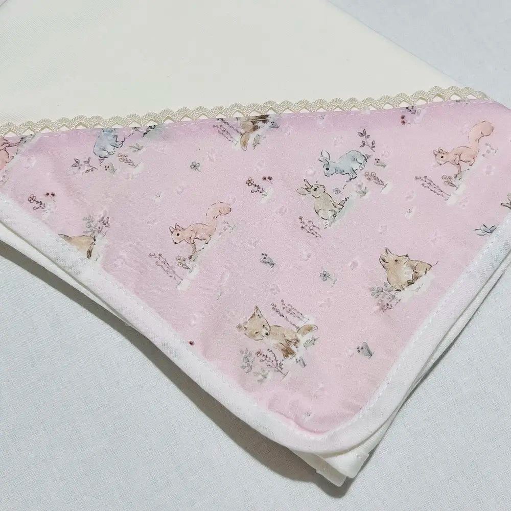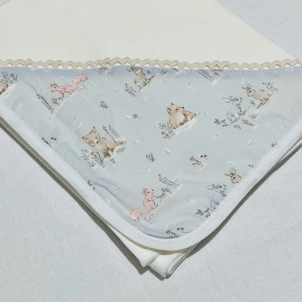 Fralda muito fofinha em algodão com estampa de animais e renda