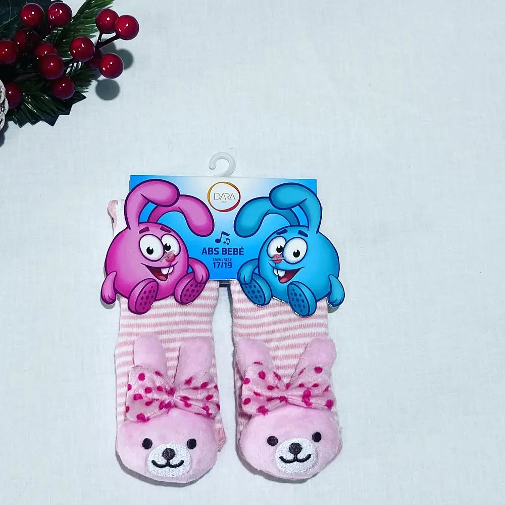 São anti-derrapante e tem um "bichinho" na ponta do pé com chocalho, além de serem quentinhas.