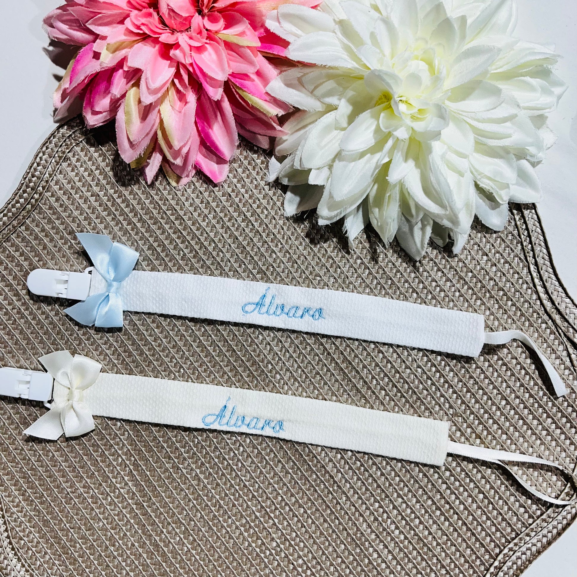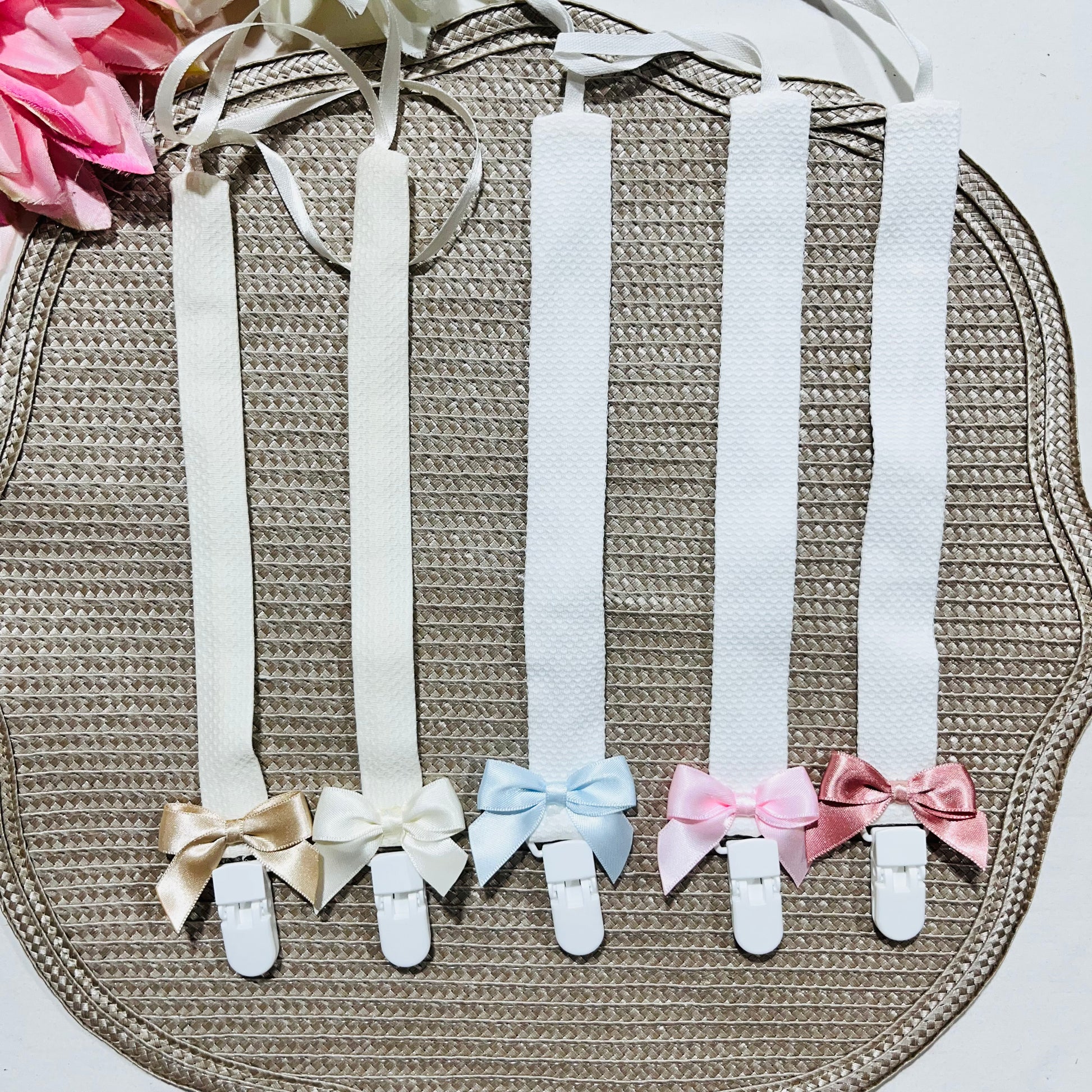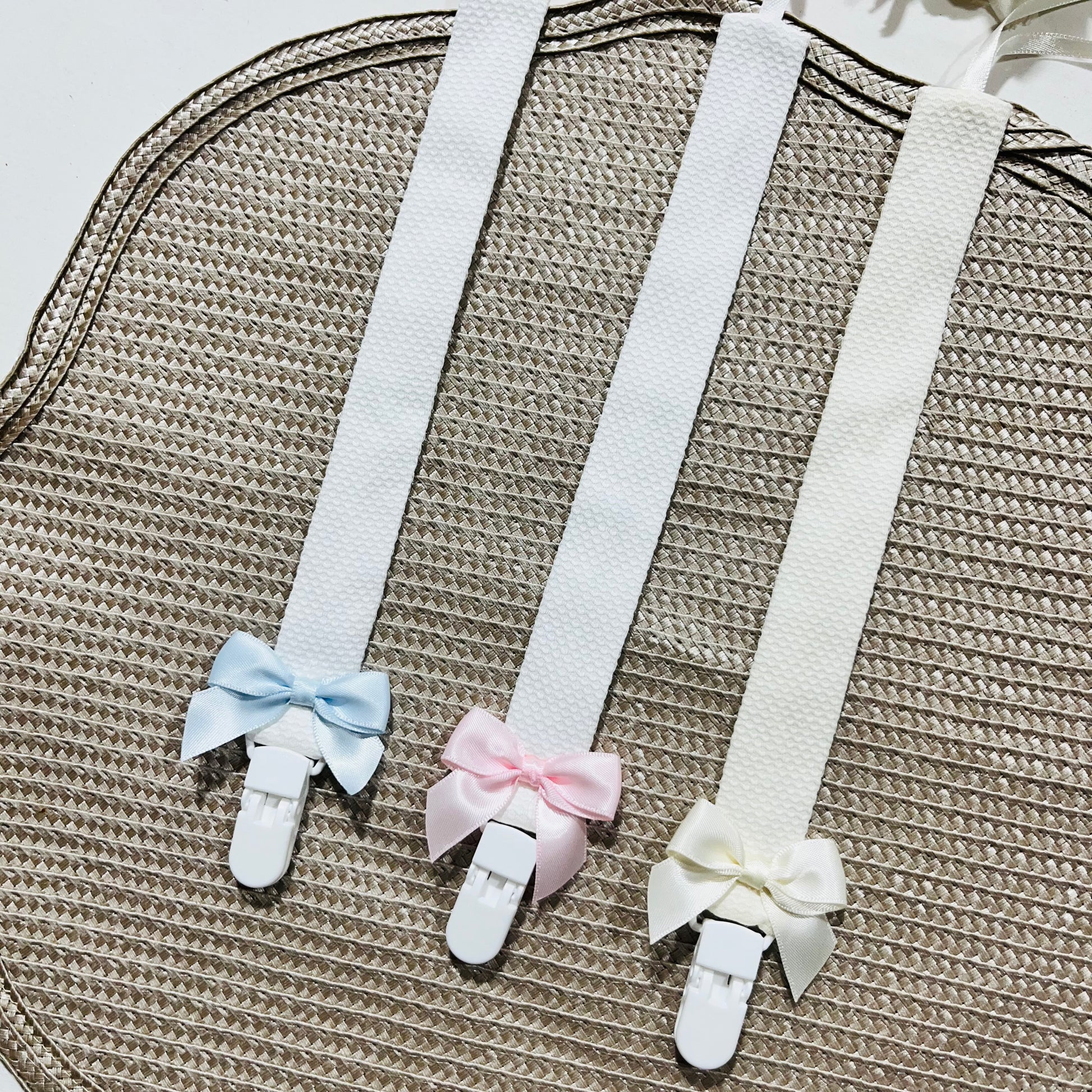 Um lindo prende chupeta em tecido com lacinho na ponta.