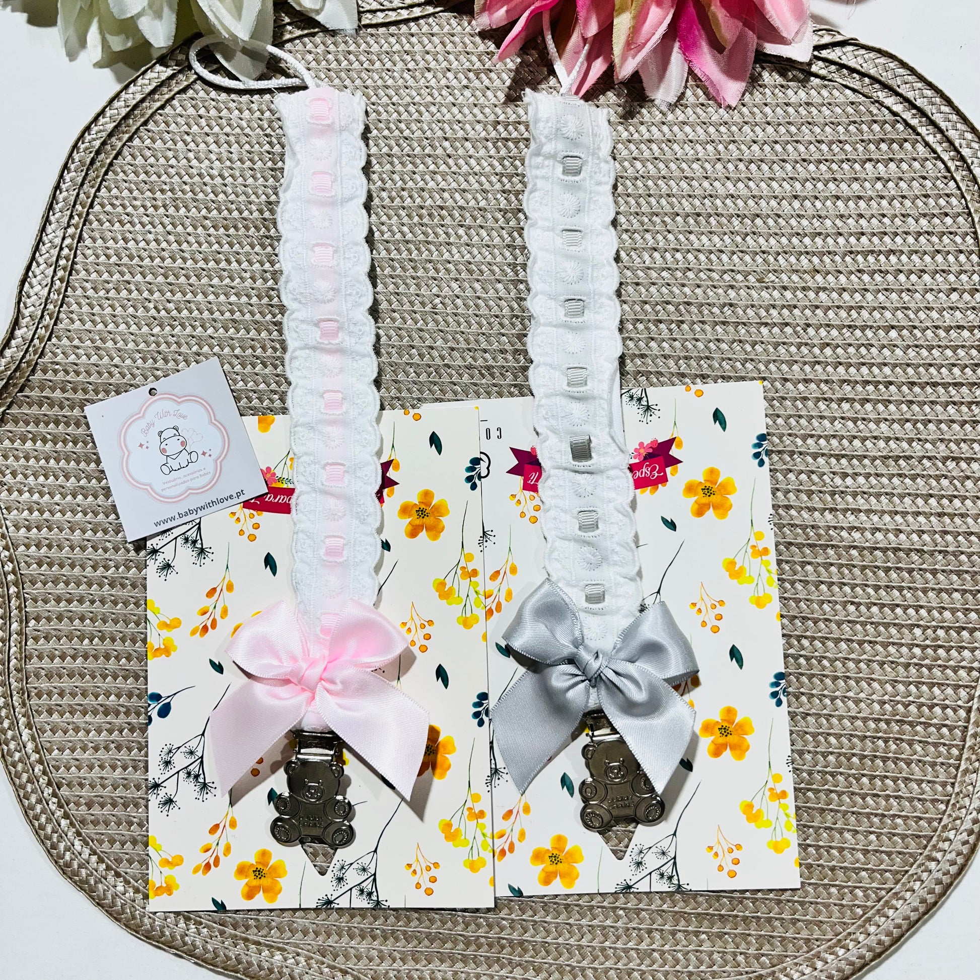 Perfeito para ocasiões especiais. Fixam-se à roupa com um clip de aço inox pelo que se adaptam a qualquer chupeta com argola.