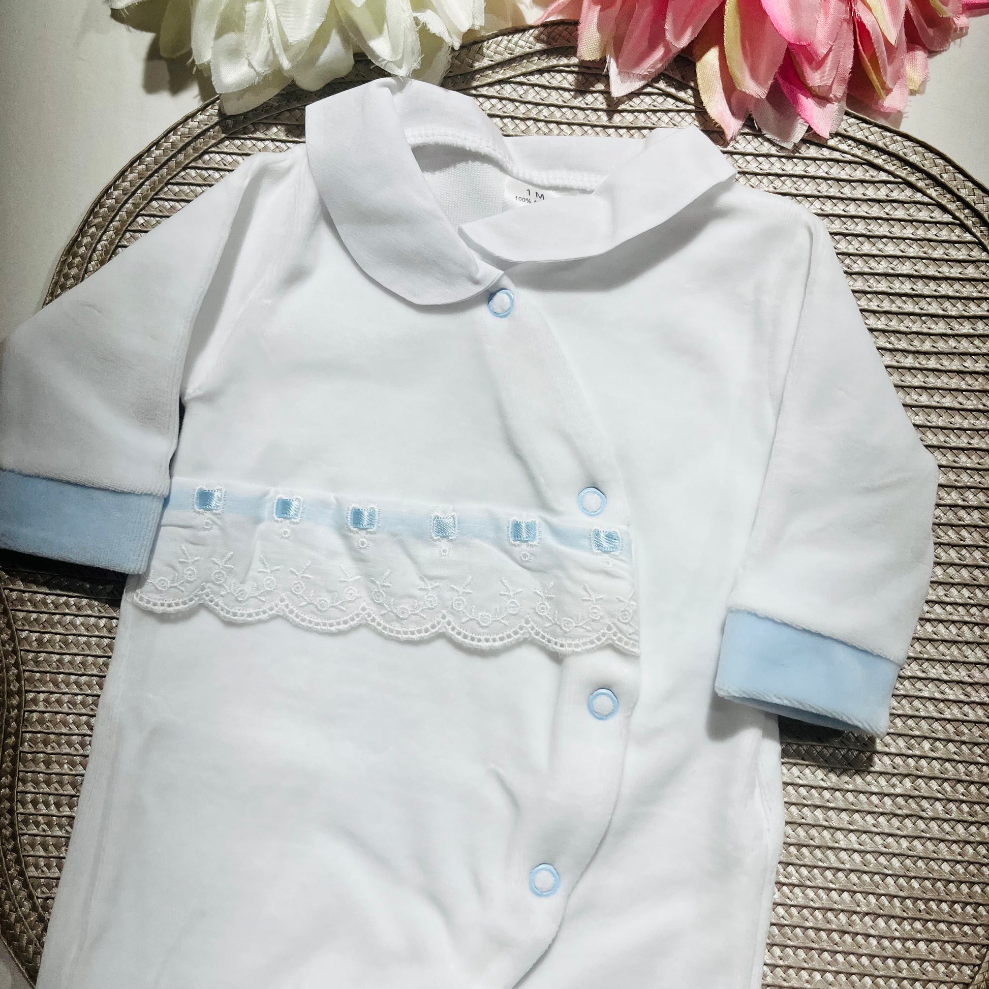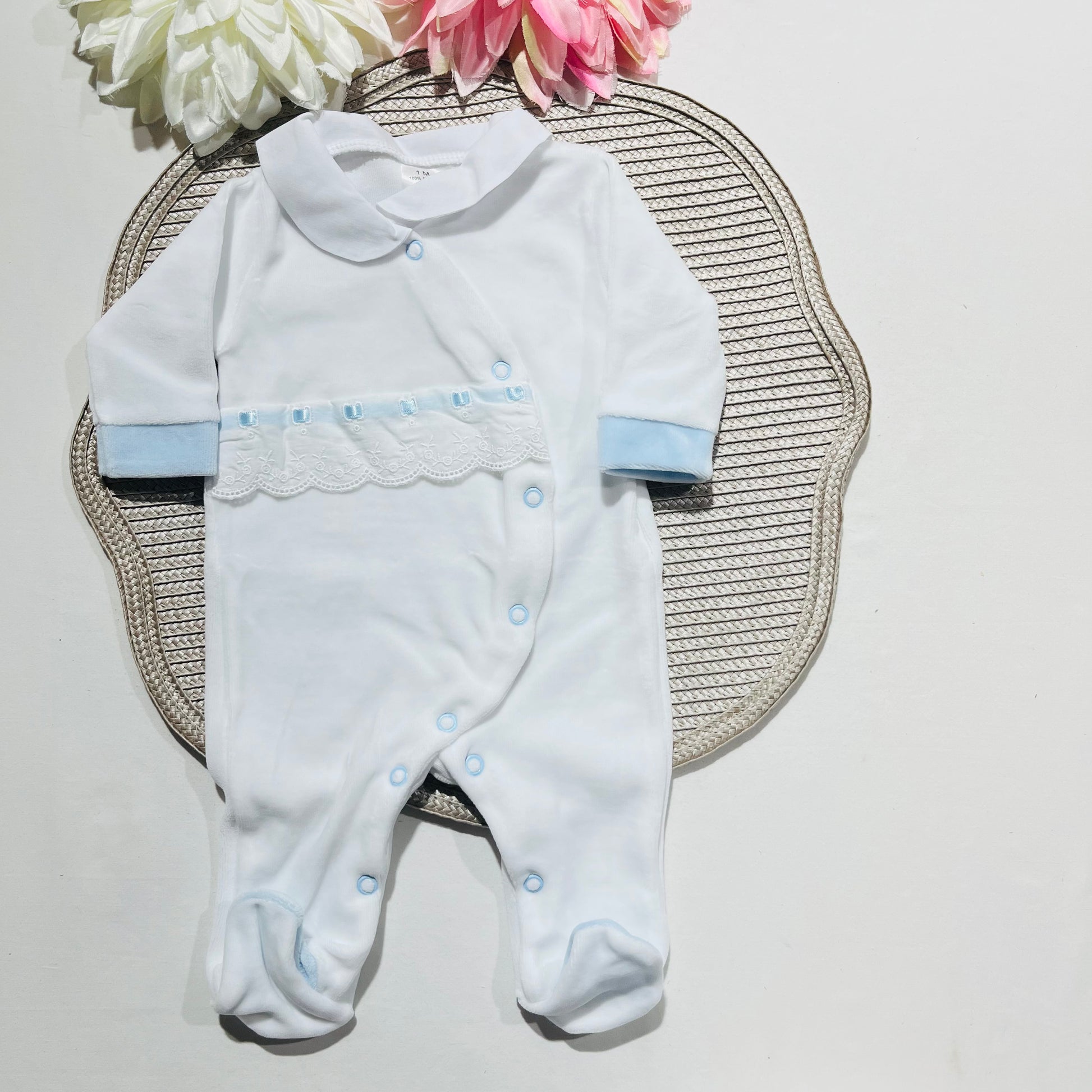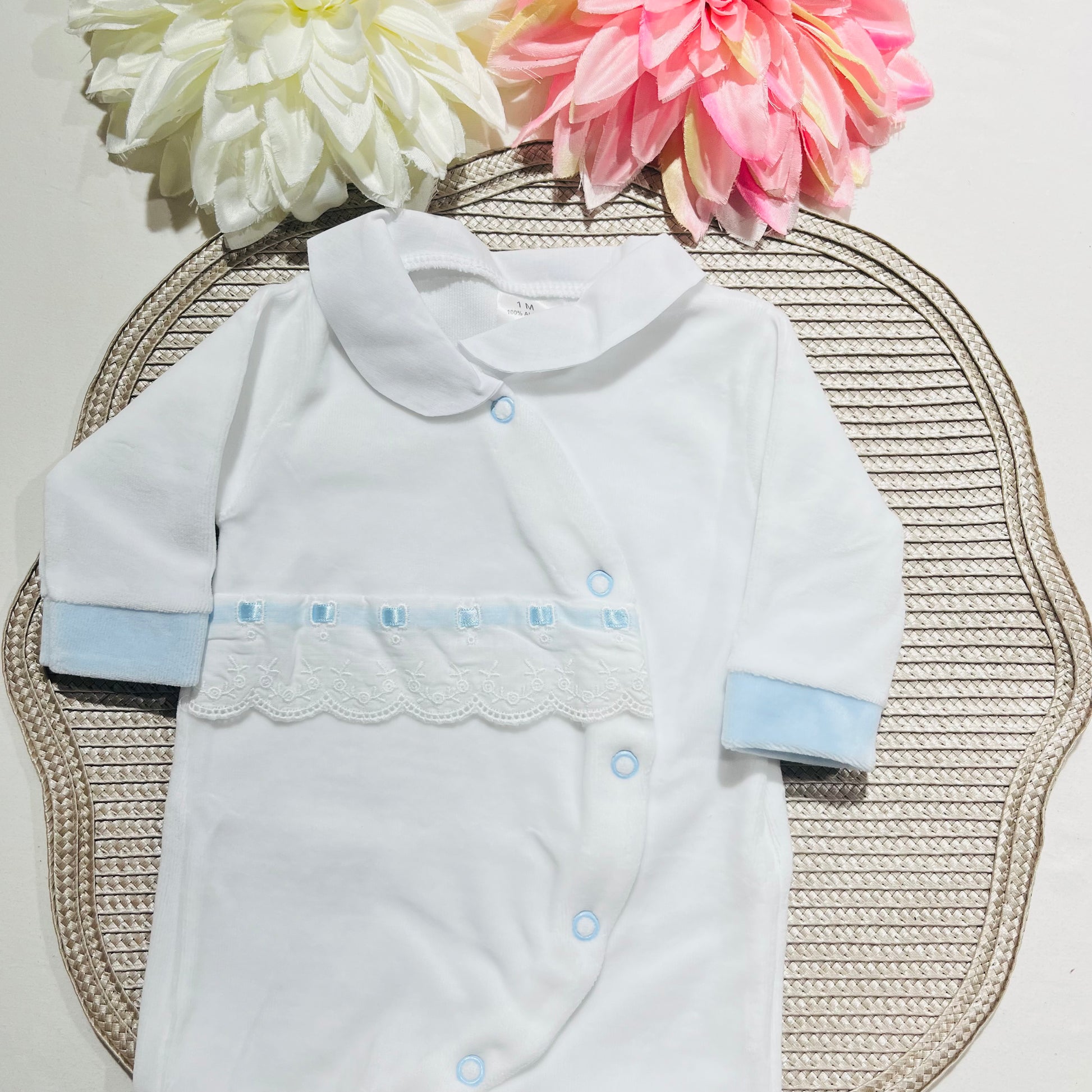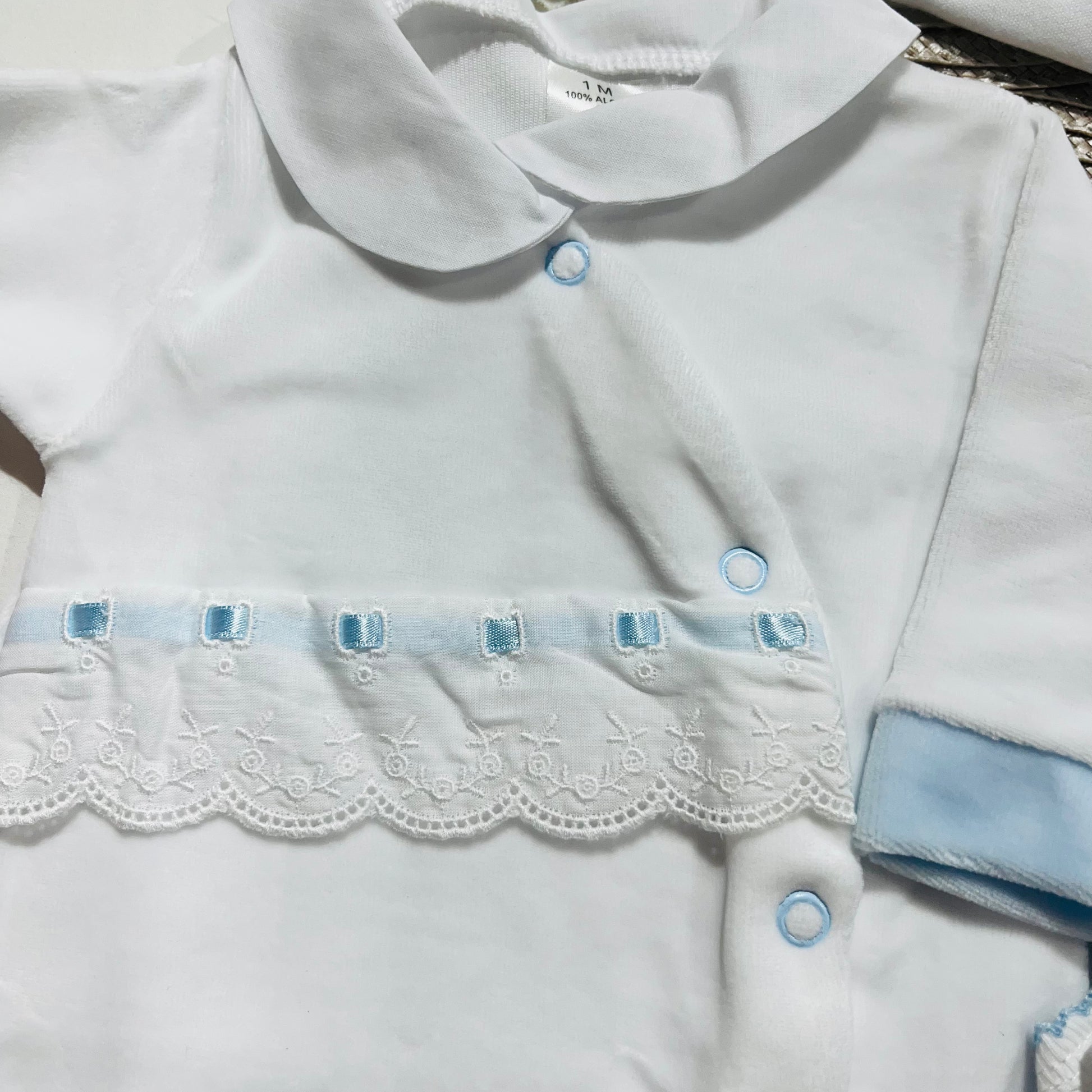 Babygrow em veludo com gola em tecido e conjunto interior com carda em algodão