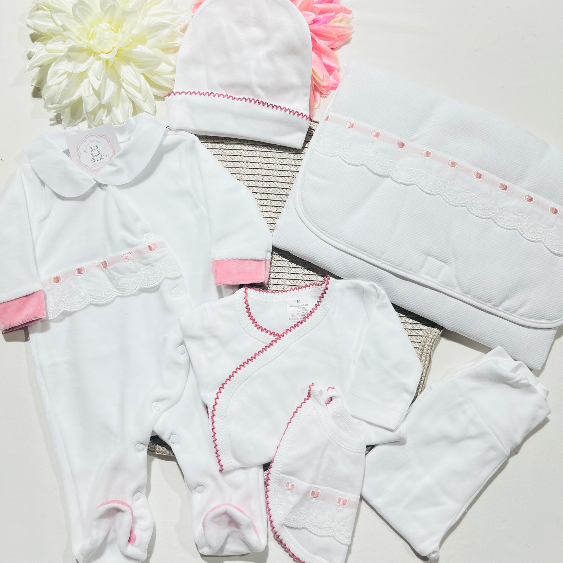 Composto por: Saco, babygrow, body manga comprida, collants e gorro