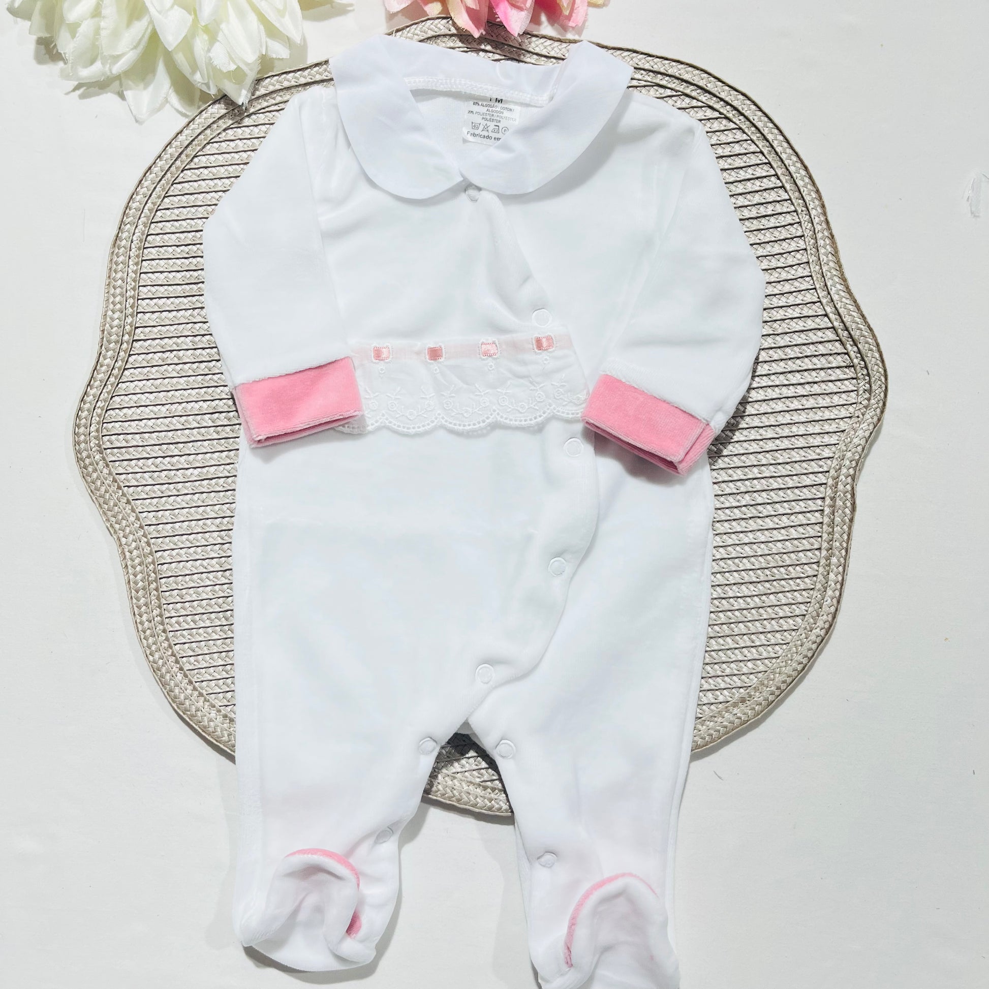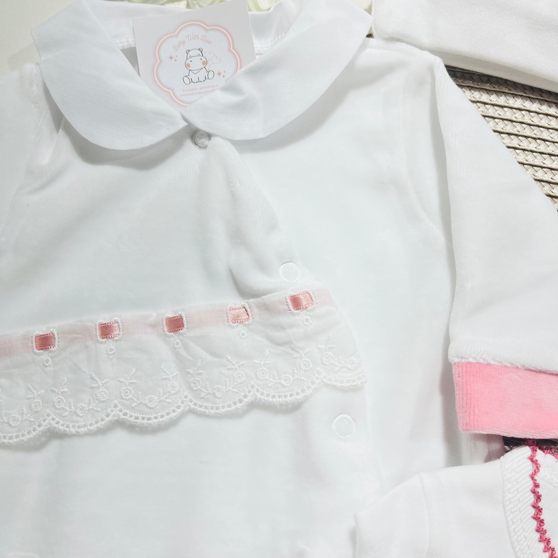 Primeira roupinha branco para recém-nascido em veludo com bordado inglês