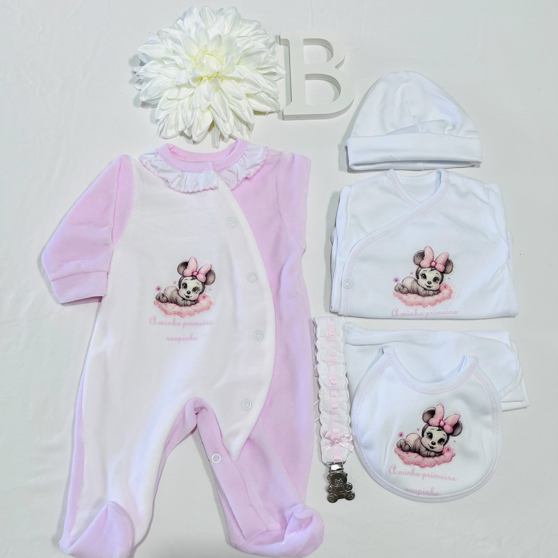Composto por: Babygrow em veludo, body, collant, babete, gorro e prende chupeta ursinho.