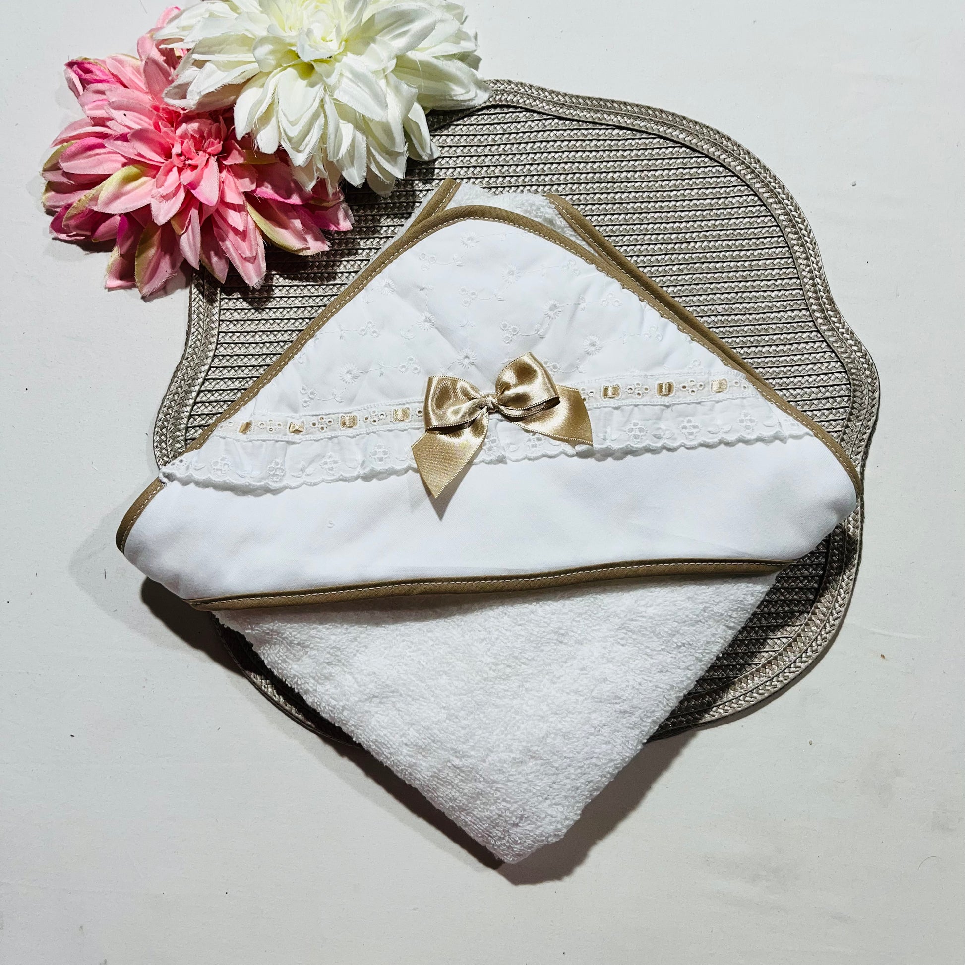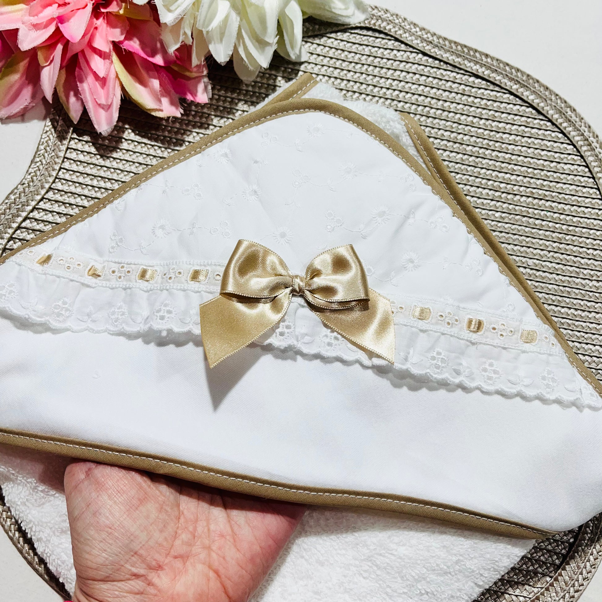 Toalha de Banho em algodão para Bebé com bordado inglês - Bege