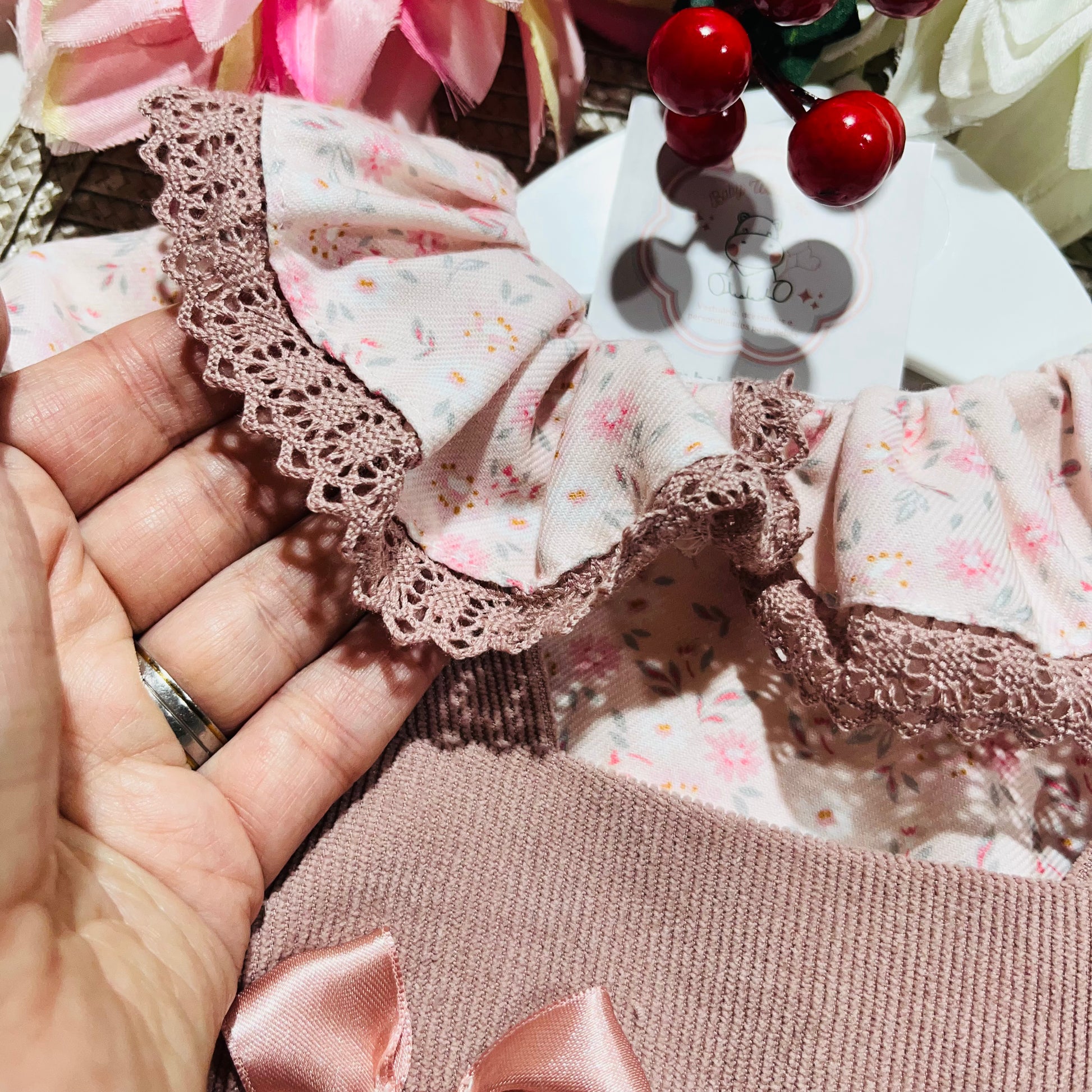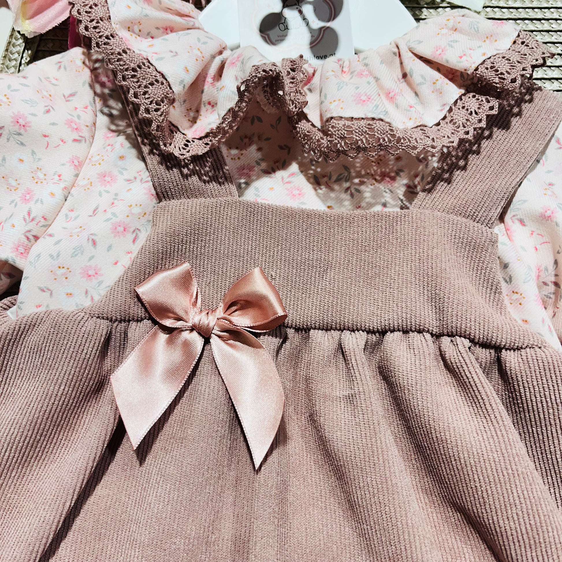 Composto por: Vestido em bombazina fina com lacinho. É forrado com tecido cardado e trás o tapa - fraldas. Abotoa atrás e as laças são ajustáveis.