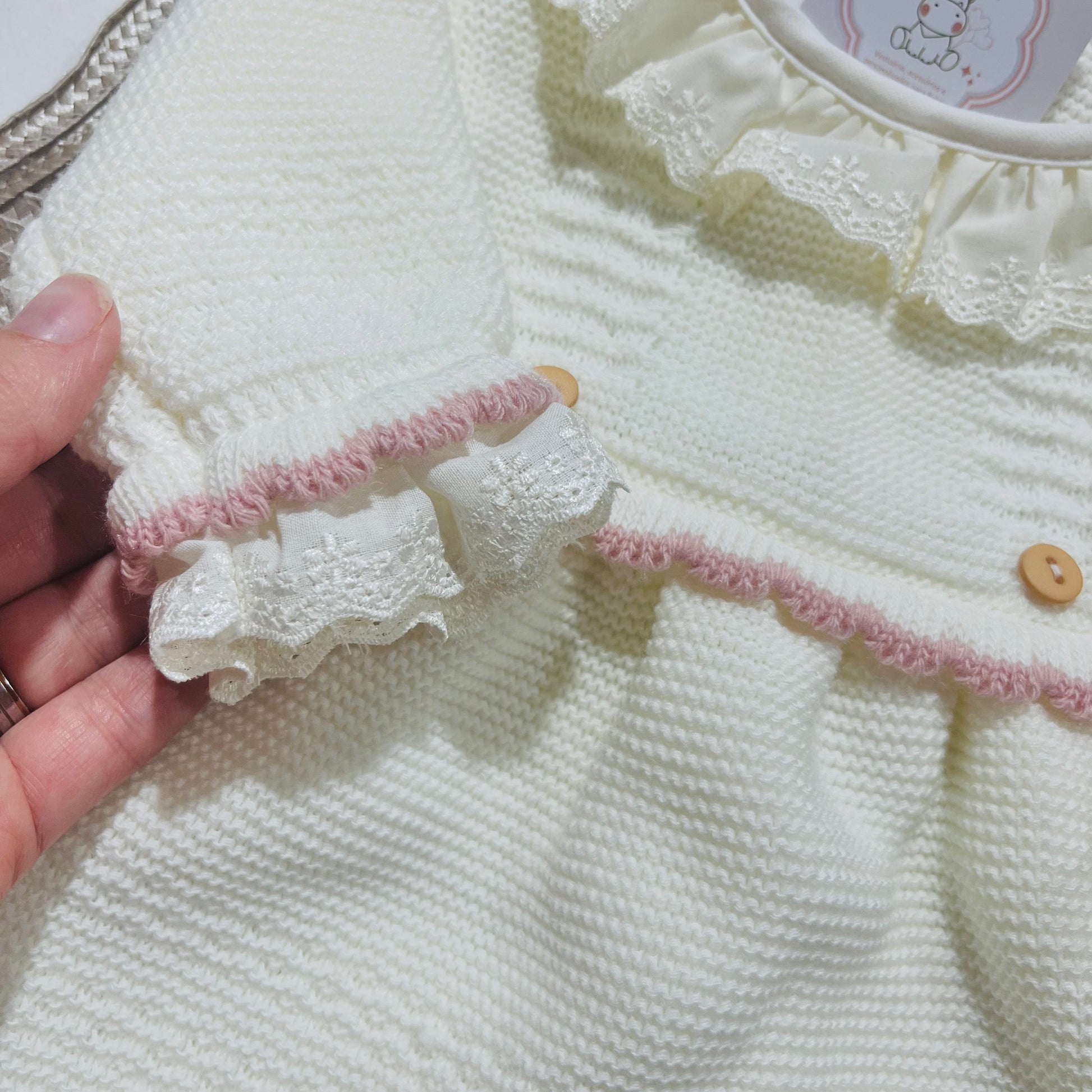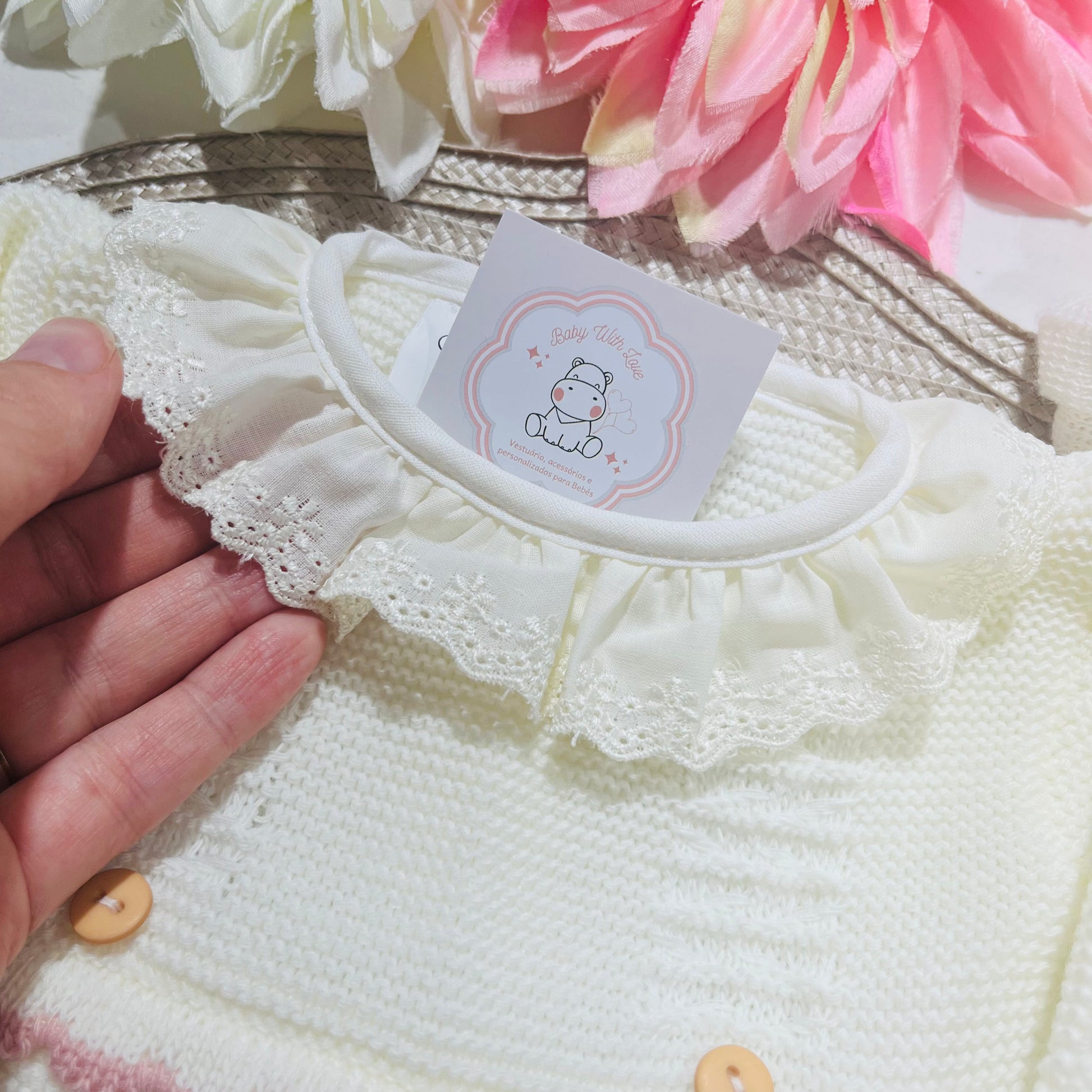 Vestido com renda na gola e punhos o que o torna muito delicado e amoroso. vai deixar a sua bebé um encanto, além disso tem detalhes em rosa velho.